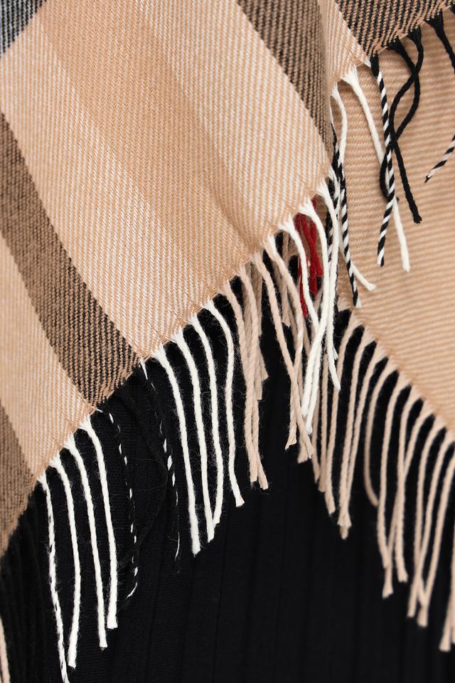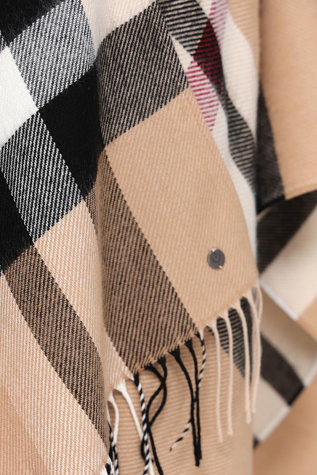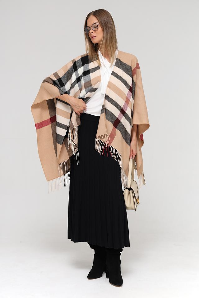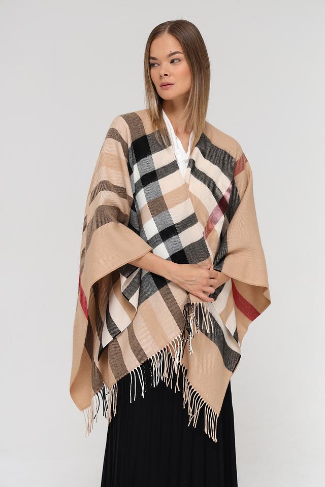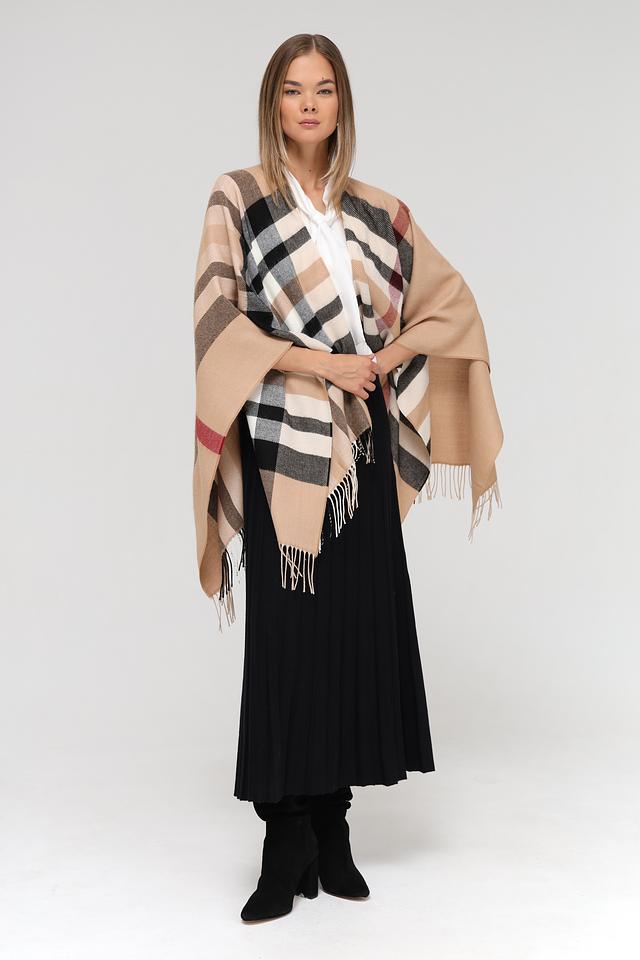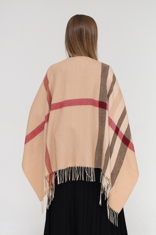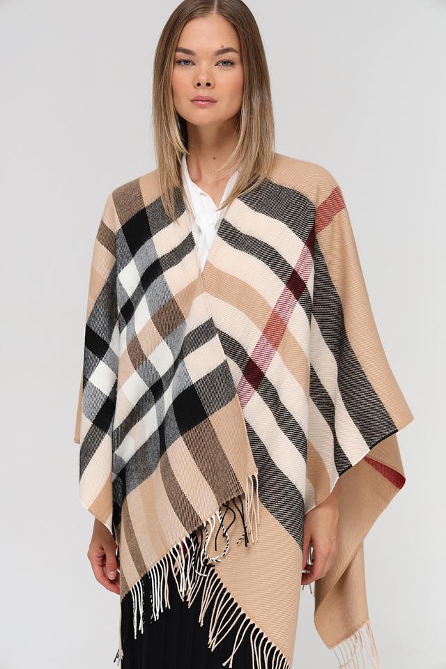 Пончо выполнено в классическую клетку, сочетающую в себе бежевые, черные и бордовые оттенки. Декоративная бахрома по краям придает изделию завершенный вид и добавляет динамики.