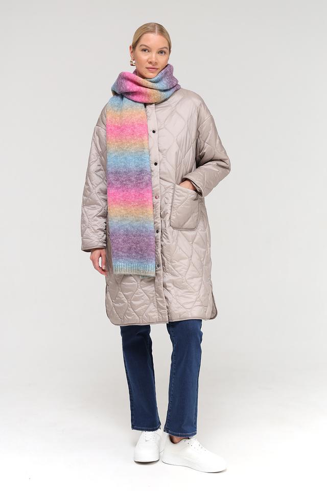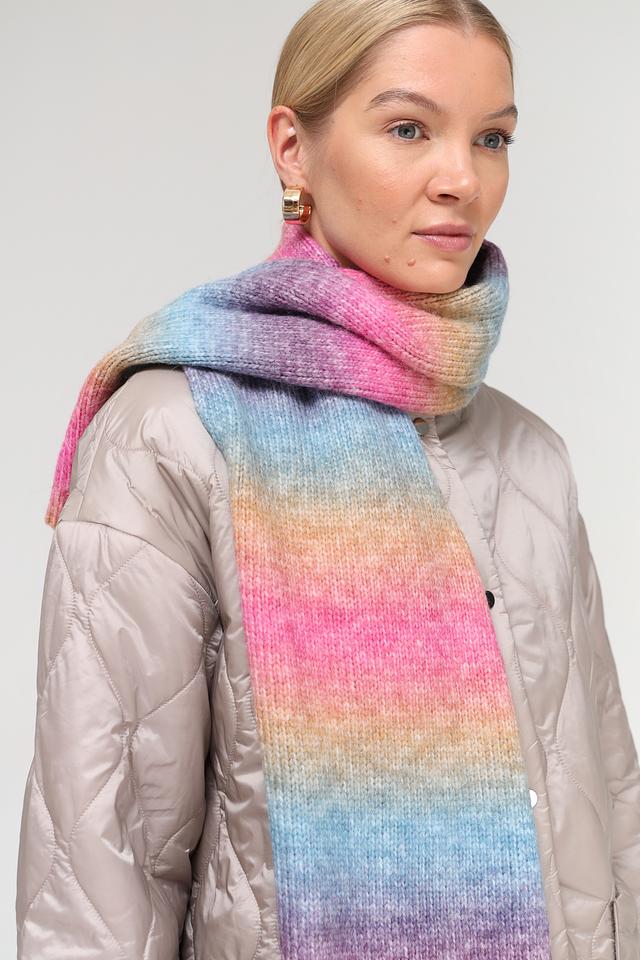 Шарф отличается широкой цветовой гаммой, сочетающей в себе оттенки розового, голубого, фиолетового, желтого и оранжевого. Такое разнообразие цветов позволяет легко сочетать шарф с различными предметами гардероба.