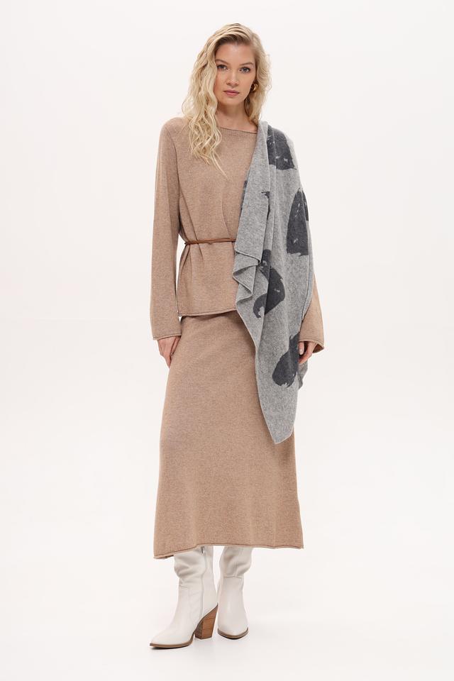Платок имеет прямоугольную форму и достаточно большой размер, что позволяет носить его как шарф, палантин или накидку. Он идеально подойдет для прохладной погоды, согревая и защищая от ветра.