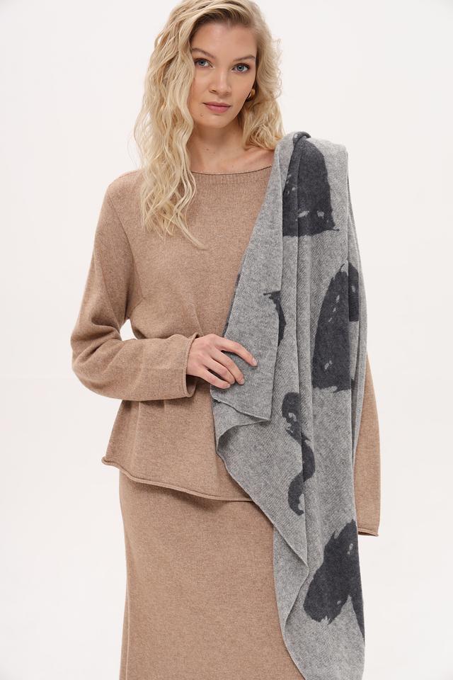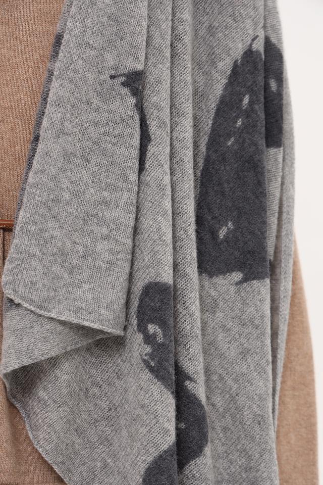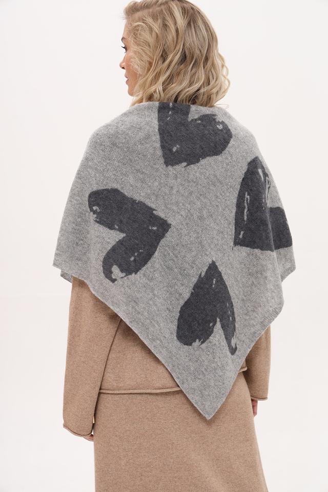 Основной цвет платка – серый, украшенный графичным принтом в виде тёмно-серых сердец. Такой рисунок добавляет изделию оригинальности и позволяет сочетать его с различными стилями одежды.
