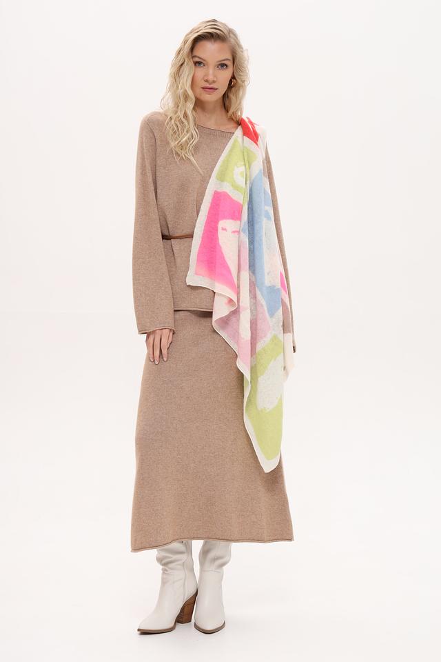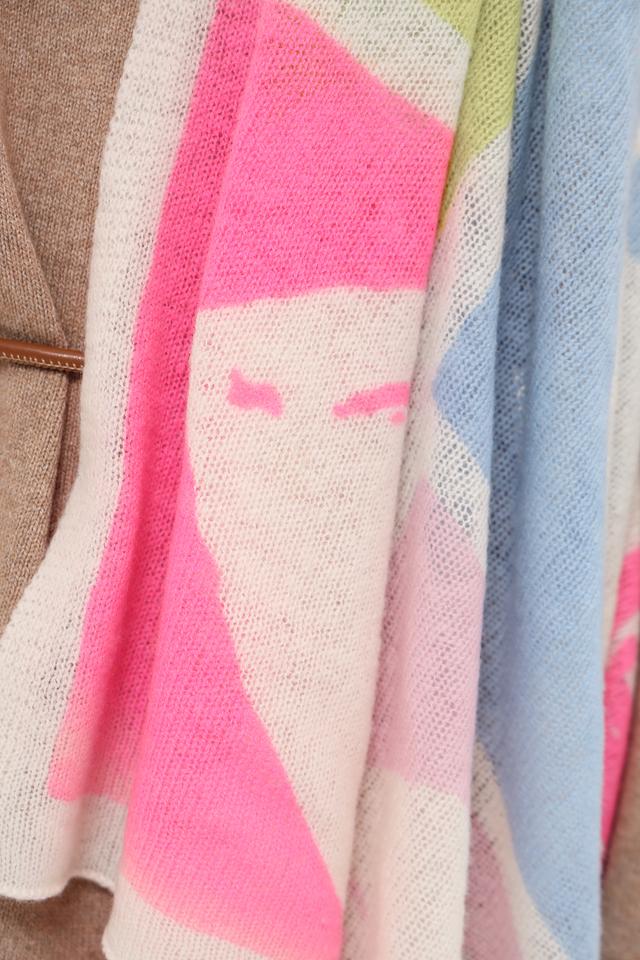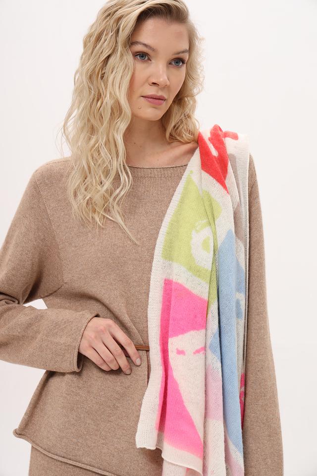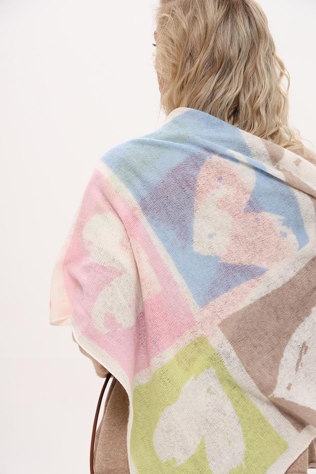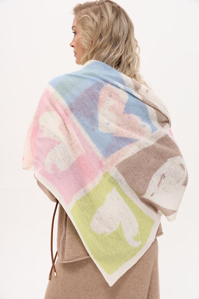 Дизайн платка представляет собой абстрактный рисунок, выполненный в разнообразной цветовой гамме, включая розовый, голубой, зеленый и красный. Такое сочетание цветов позволяет легко сочетать платок с различными нарядами.