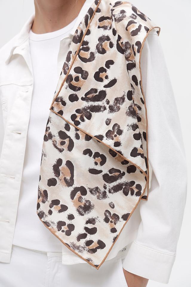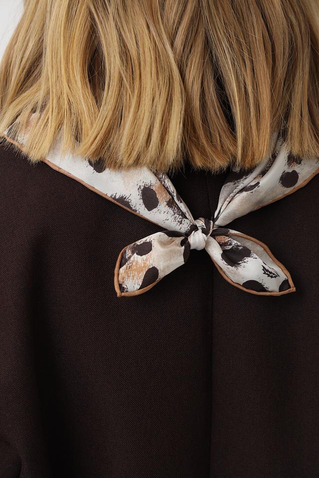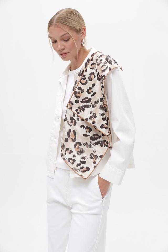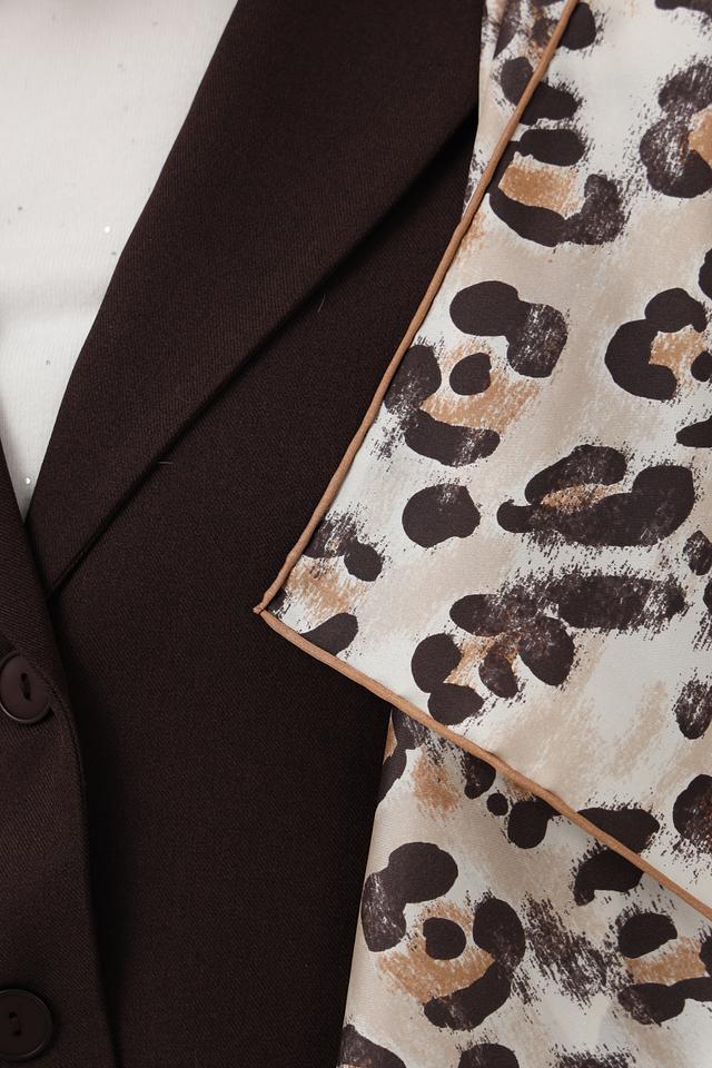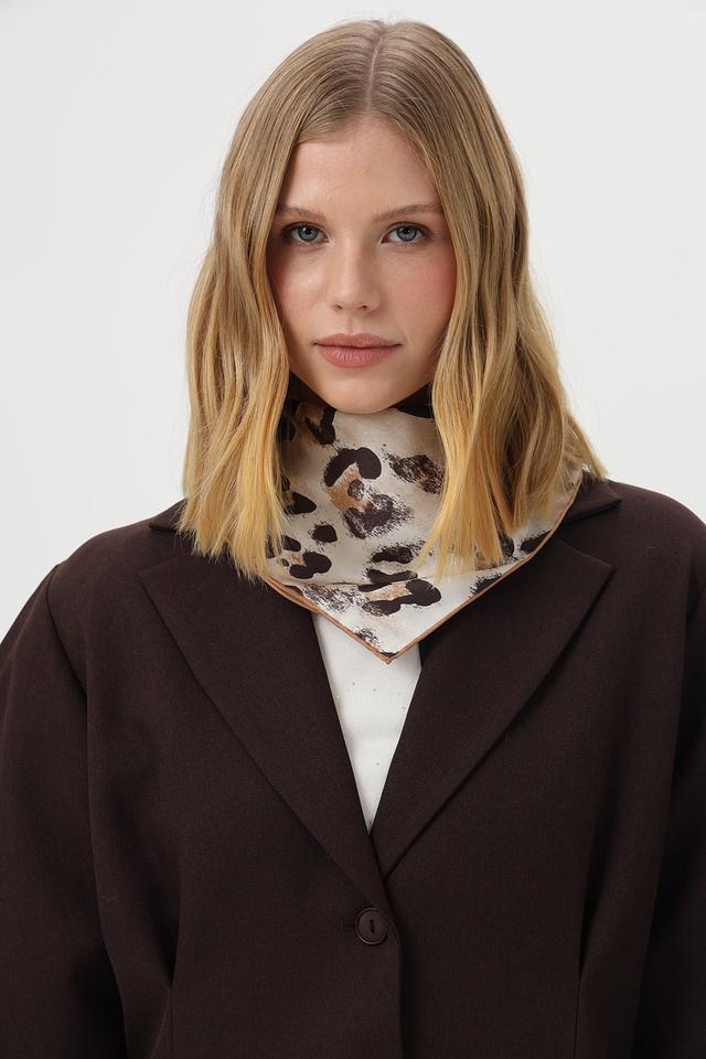Основной цвет платка – коричневый, но его украшает эффектный леопардовый принт, выполненный в сочетании коричневых, бежевых и чёрных оттенков.