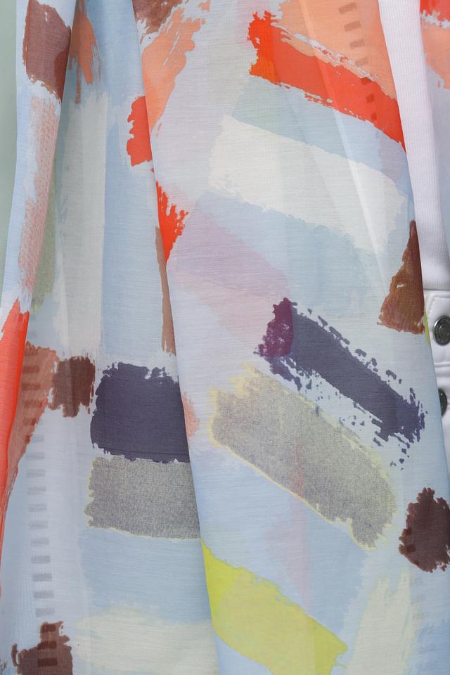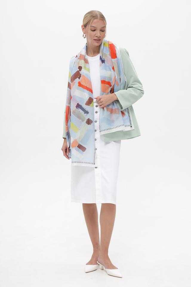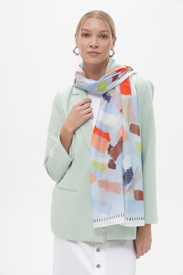 Этот шарф от Fraas – идеальный аксессуар для создания яркого и запоминающегося образа. Шарф выполнен в светло-голубой цветовой гамме и украшен абстрактным рисунком, выполненным в различных оттенках: оранжевого, коричневого, фиолетового, зеленого и желтого.