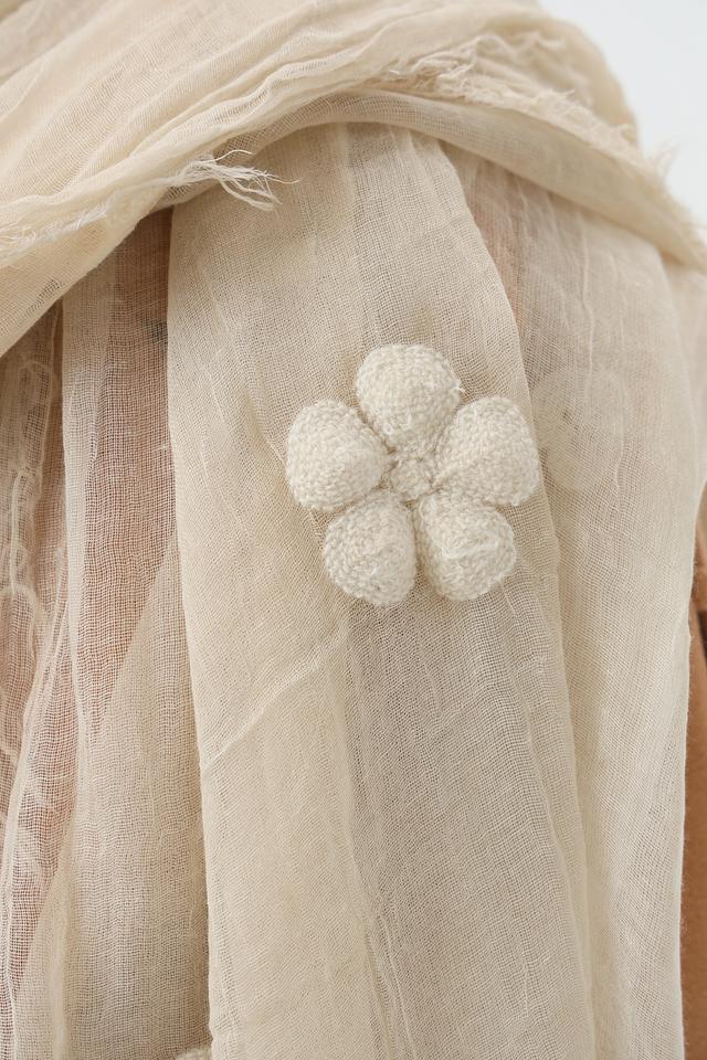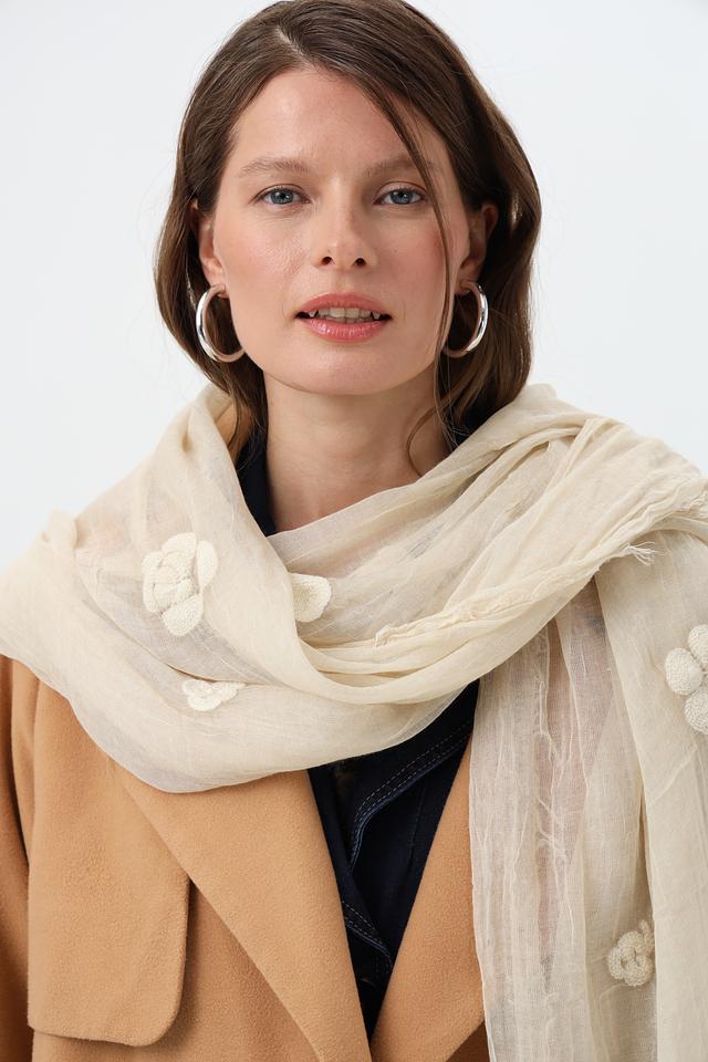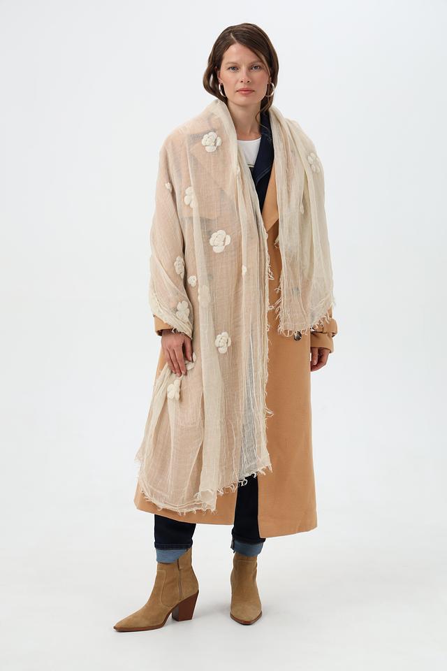 Шарф украшен объемными декоративными цветами, которые привносят в его дизайн нотку романтики. Легкая и воздушная ткань приятна на ощупь и комфортна в носке.