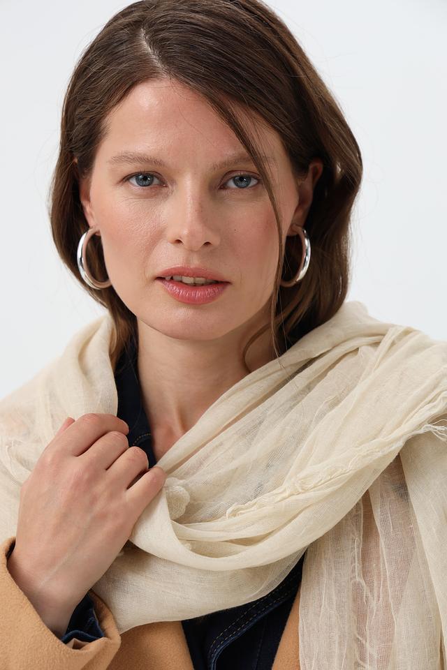 Шарф имеет бахрому по краям, что добавляет ему текстуру и завершенность. Состав: 30% вискоза, 20% полиэстер, 50% полиакрил. Этот шарф сочетает в себе стиль, комфорт и качество.
