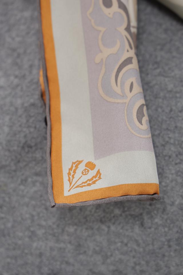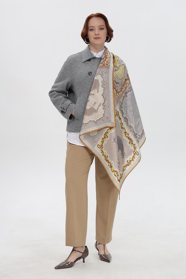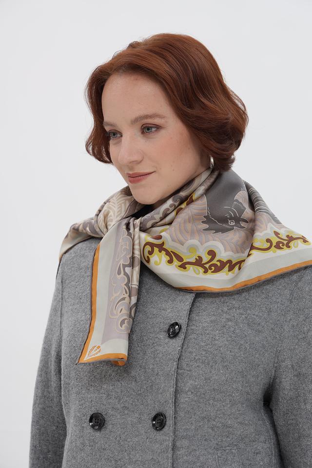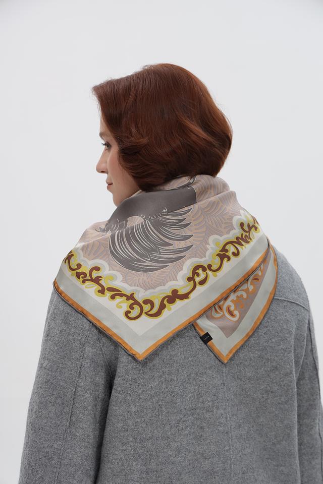 Платок имеет квадратную форму и украшен сложным, многоцветным принтом, включающим в себя элементы растительного орнамента и геометрические узоры. Преобладающие цвета в рисунке – светло-серый, бежевый, горчичный и оранжевый.