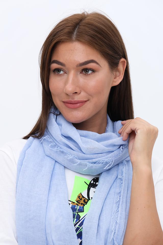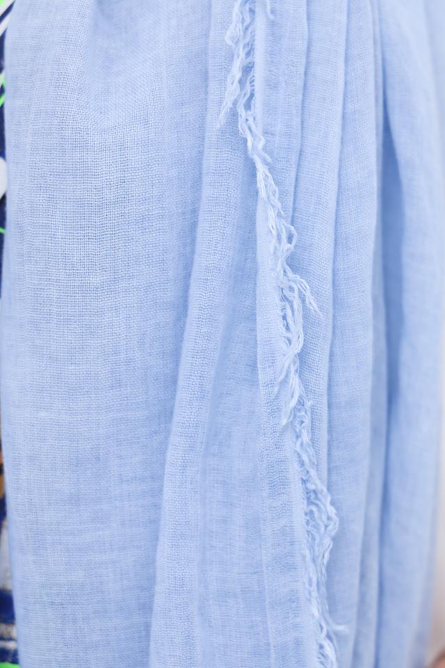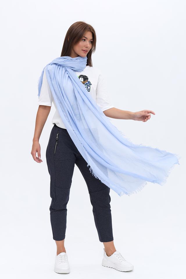 Особенностью данного шарфа является наличие бахромы по краям, которая добавляет ему воздушности и изысканности. Текстура ткани лёгкая и приятная на ощупь, что делает шарф комфортным в носке.