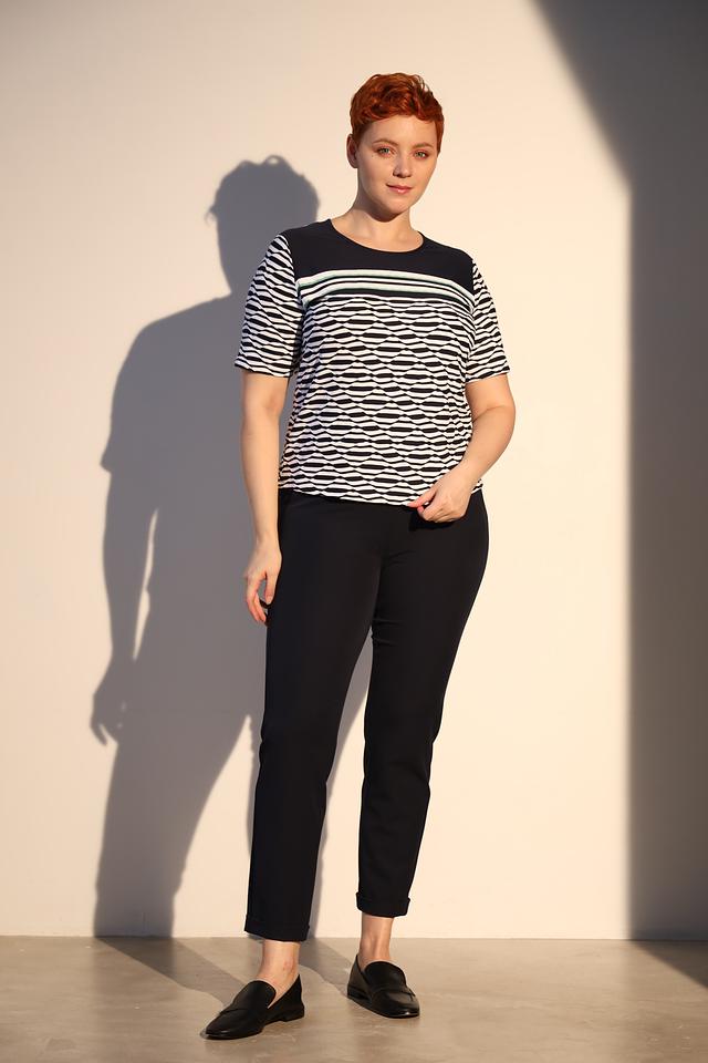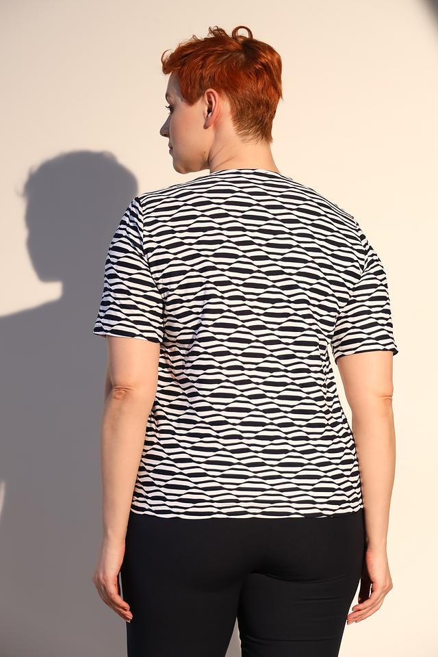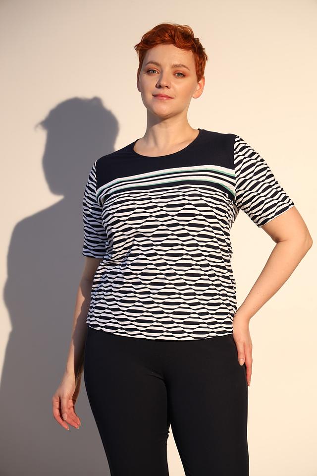 Блуза Frank Walder белого и тёмно-синего цвета с оригинальным волнистым принтом и короткими рукавами. Изготовлена из мягкого и приятного к телу материала с добавлением эластана для комфортной посадки. Состав: полиамид 95%, эластан 5%