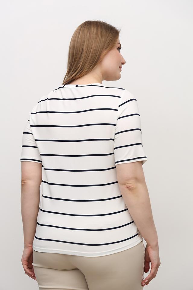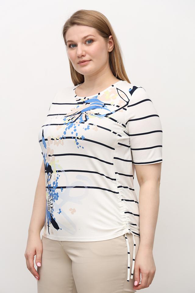 Женская футболка Frank Walder белого цвета с ярким абстрактным принтом и короткими рукавами. Модель выполнена из мягкой вискозы с добавлением эластана, обеспечивающего комфортную посадку. Футболка дополнена завязками по бокам. Состав: вискоза 96%, эластан 4%