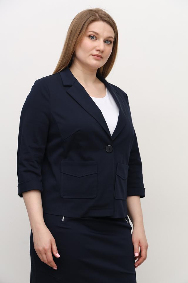 Жакет застегивается на одну пуговицу, имеет лацканы и функциональные карманы. Рукава 3/4 делают его универсальным для любого времени года. Сочетание хлопка и эластана обеспечивает комфорт при носке и сохраняет форму изделия.
