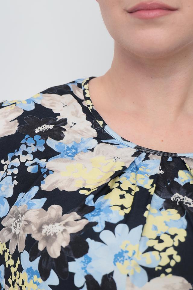 Модель имеет округлый вырез горловины и короткие рукава. Блуза выполнена из качественной вискозы с добавлением эластана, что обеспечивает мягкость, комфорт и хорошую посадку по фигуре. Ткань приятна к телу и хорошо драпируется.