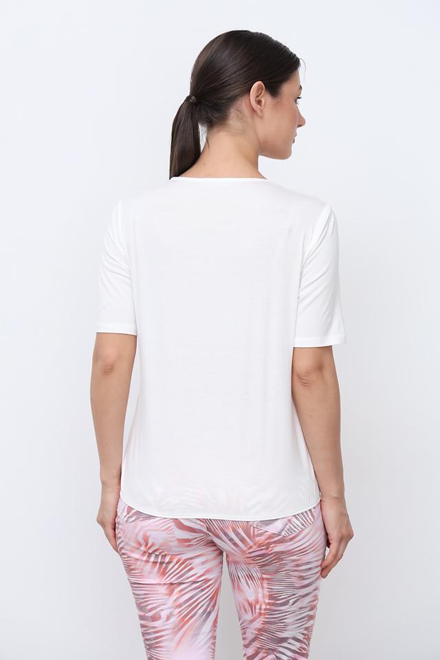Модель имеет короткие рукава и V-образный вырез горловины, который украшен небольшими завязками. Эти завязки добавляют блузе оригинальности и позволяют регулировать глубину выреза.