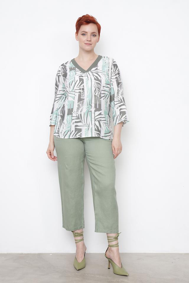 Блуза имеет свободный крой и короткие рукава, что обеспечивает свободу движений и создает легкий, непринужденный образ. V-образный вырез горловины подчеркивает женственность и изящество.