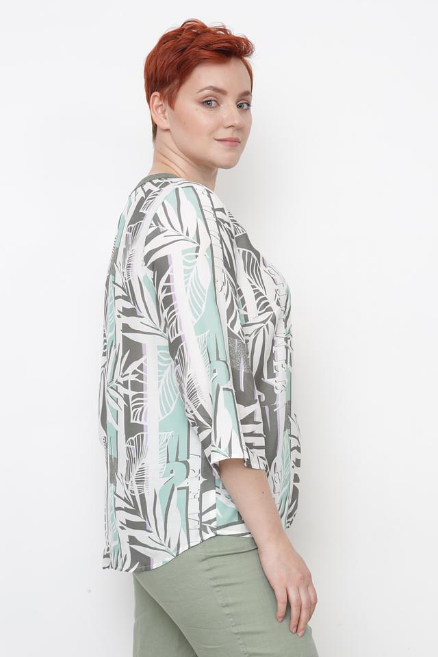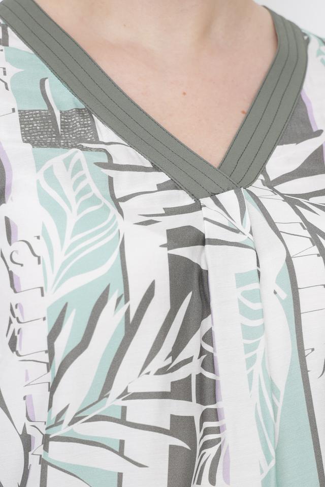 Особенностью данной модели является яркий и оригинальный принт с изображением тропических листьев в оттенках зеленого, серого и белого. Такой рисунок добавит вашему образу свежести и индивидуальности.