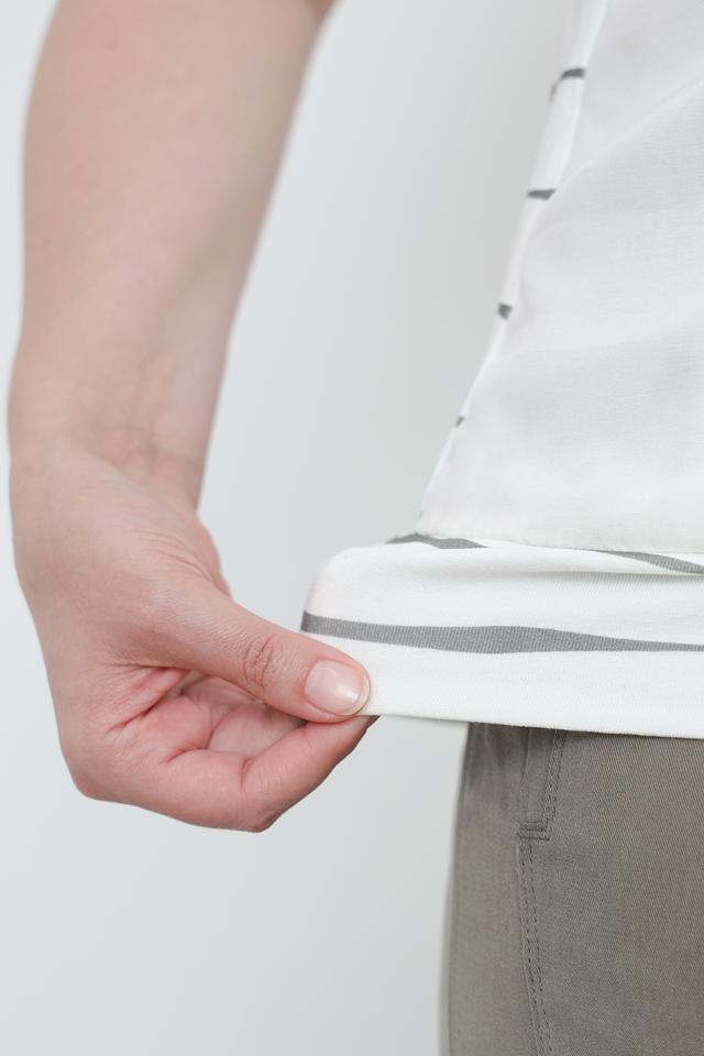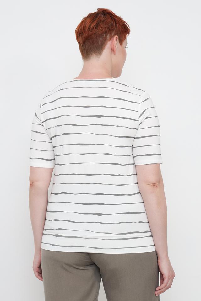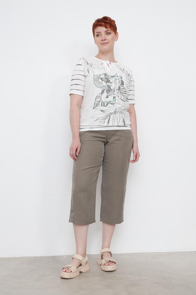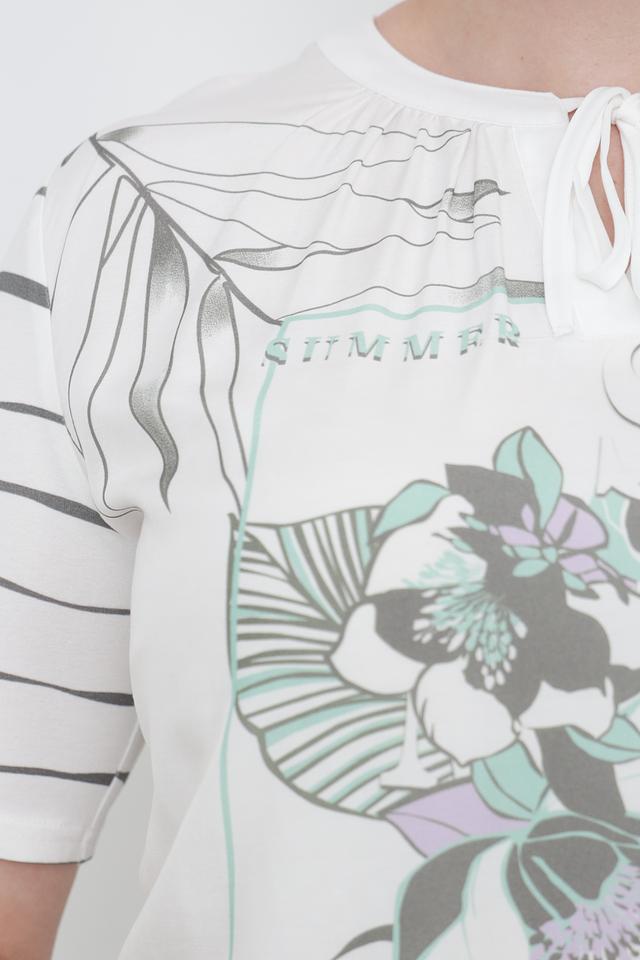 Основной цвет блузы – белый, а ярким акцентом является оригинальный принт с изображением тропических листьев и цветов в оттенках зеленого, серого и фиолетового. Короткие рукава и свободный крой обеспечивают комфорт в жаркую погоду.