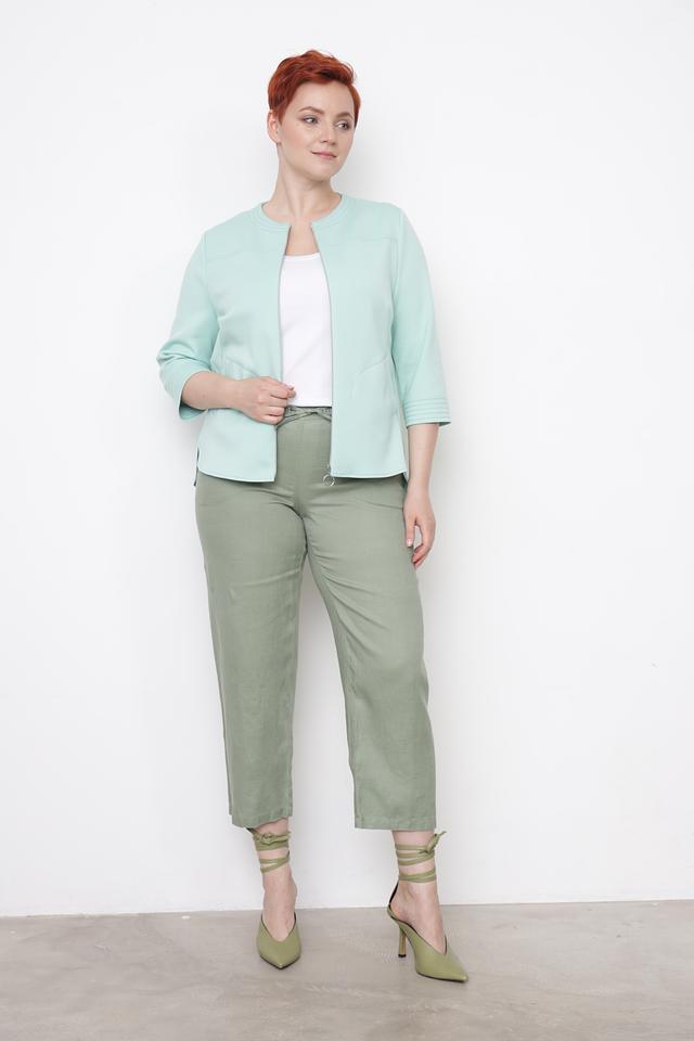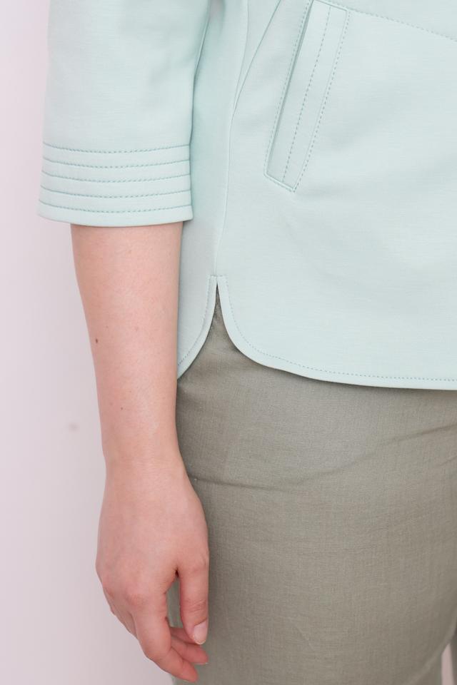 Жакет имеет прямой крой, воротник-стойку и застежку на молнию. Рукава длиной 3/4 делают его идеальным для теплой погоды. Модель дополнена двумя накладными карманами.