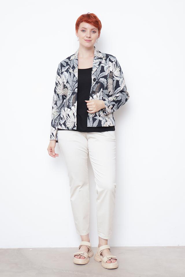 Состав ткани: 97% хлопок и 3% эластан, что обеспечивает приятные тактильные ощущения и хорошую посадку по фигуре. Этот жакет станет отличным выбором для создания как повседневных, так и более формальных образов.