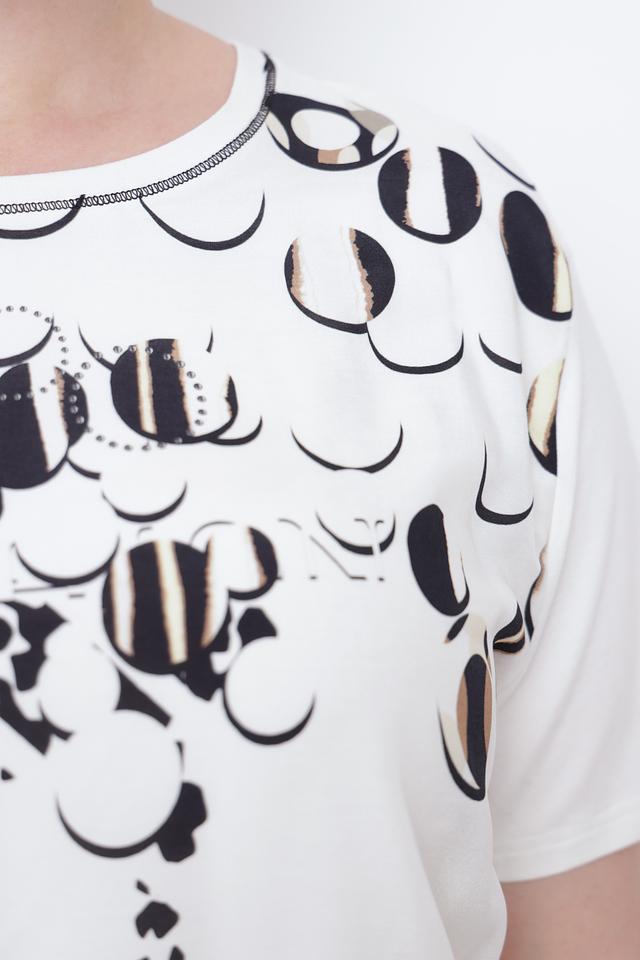 Модель отличается свободным кроем и короткими рукавами, что делает её идеальным выбором для тёплой погоды. Главная особенность блузы – оригинальный принт в чёрно-белой гамме, который придаёт ей неповторимый стиль.