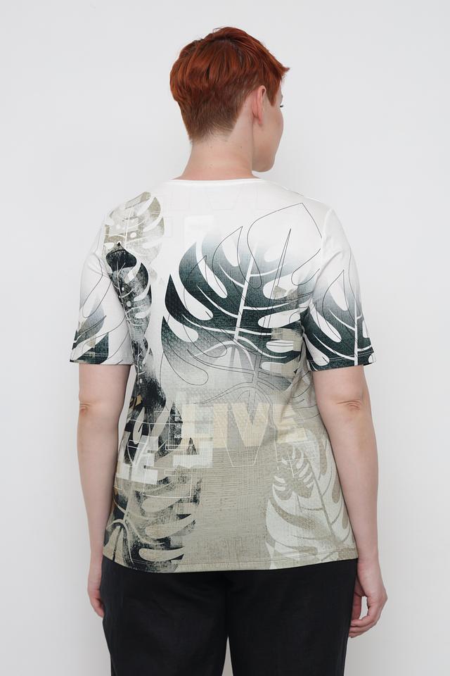 Женская футболка Frank Walder белого цвета с оригинальным принтом в виде листьев и декоративной вышивкой. Модель выполнена из мягкой вискозы с добавлением эластана, обеспечивающего комфортную посадку. Состав: вискоза 95%, эластан 5%
