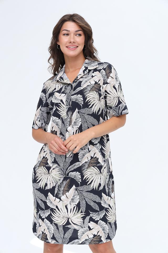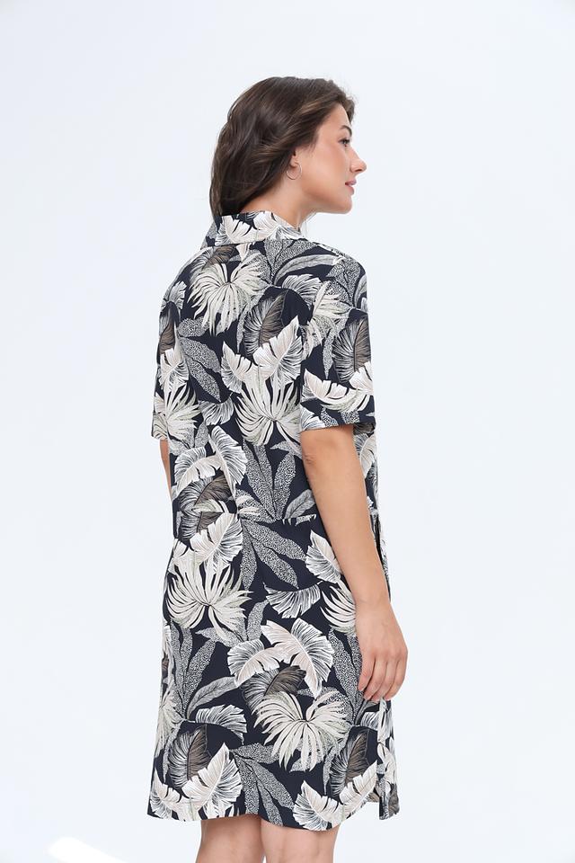 Платье имеет прямой силуэт, короткие рукава и воротник рубашечного типа. Застежка на пуговицах по всей длине позволяет регулировать степень открытости. Яркий тропический принт с изображением листьев пальм придает образу свежесть и оригинальность.