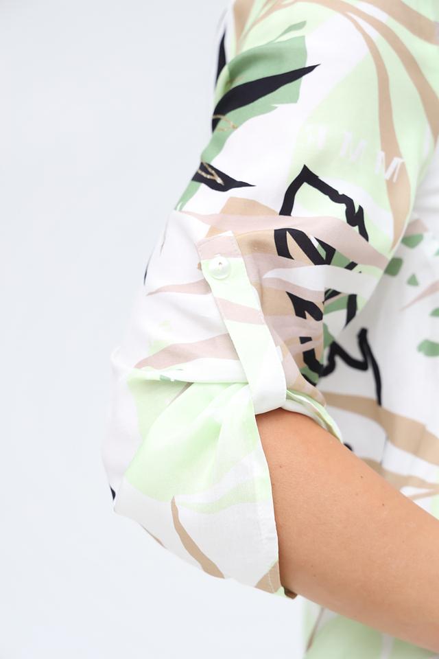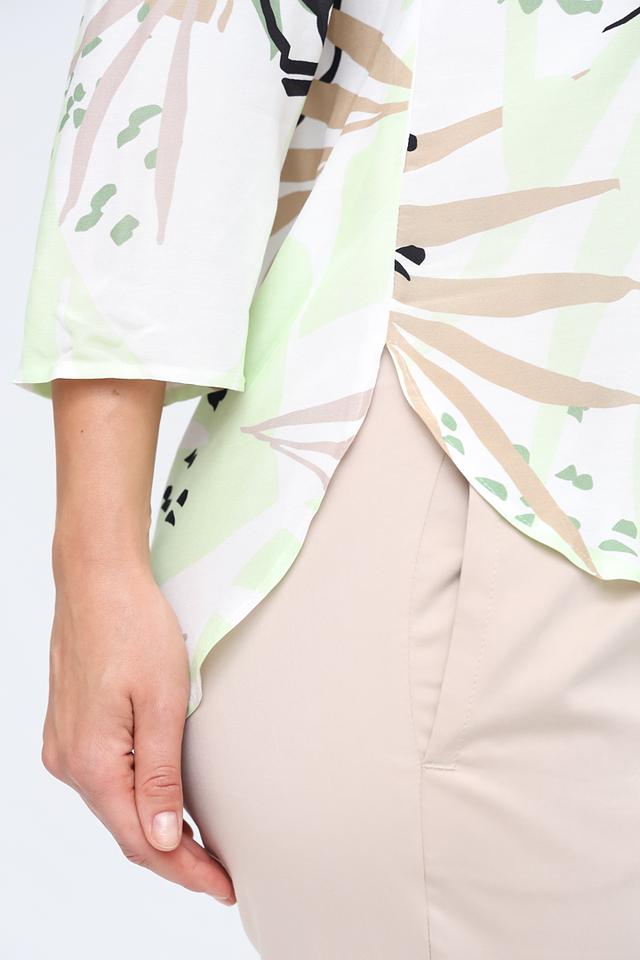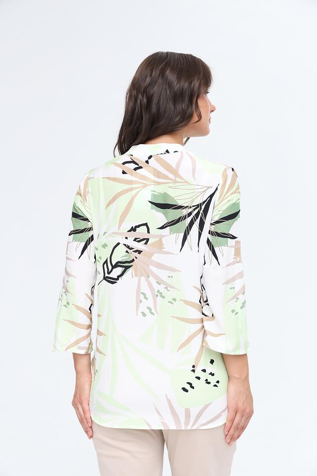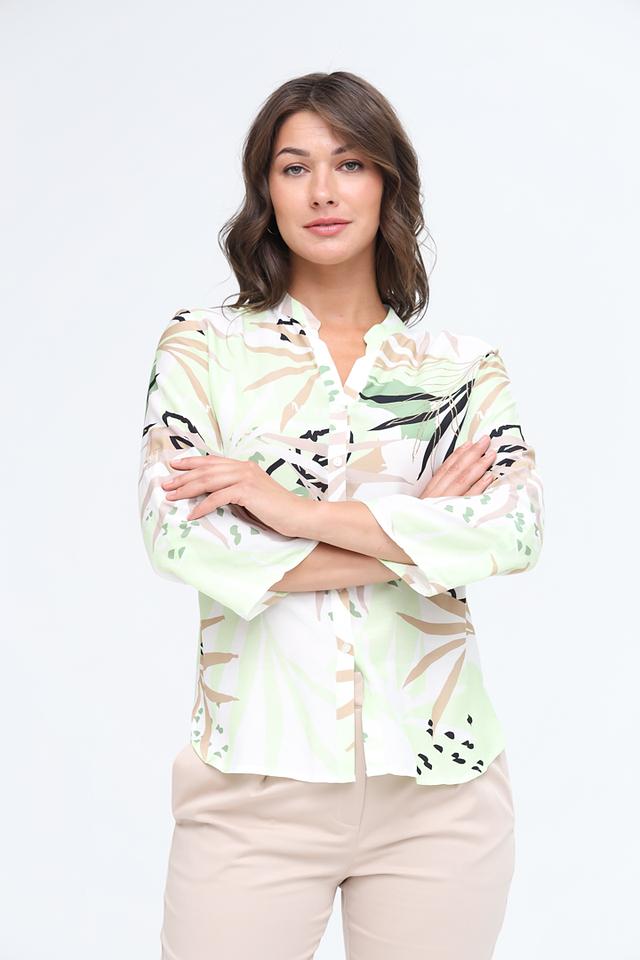 Особенностью модели является яркий принт с изображением листьев и растительных мотивов в зелёных, бежевых и чёрных тонах. Блуза имеет классический крой с воротником и застёжкой на пуговицы. Рукава 3/4 делают её универсальной для любого времени года.