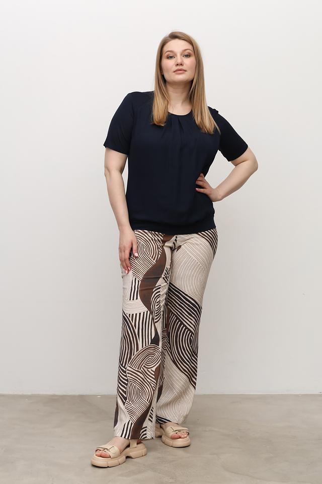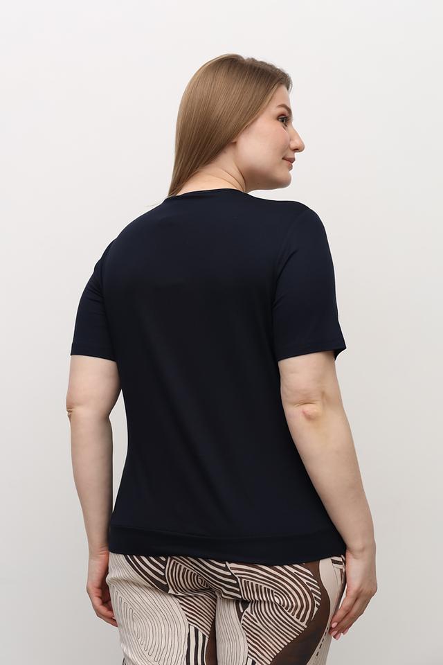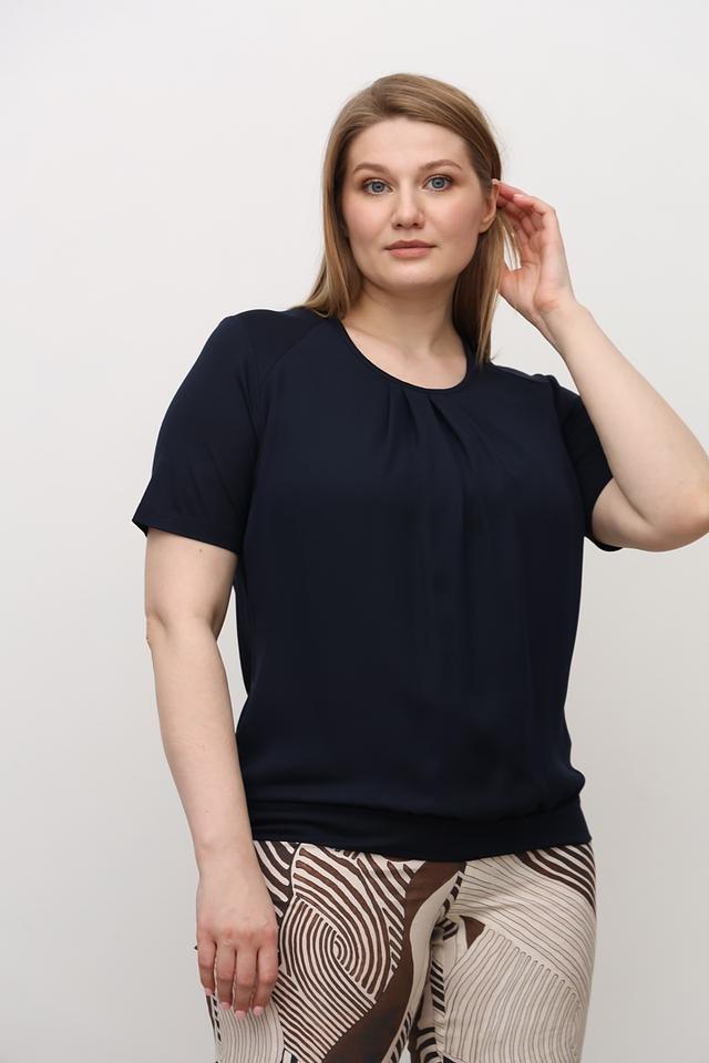 Блуза имеет классический крой с короткими рукавами и округлым вырезом горловины. Спереди блуза украшена небольшими складками, которые придают ей более изысканный вид. Тёмно-синий цвет делает эту блузу универсальной и подходящей для различных случаев.