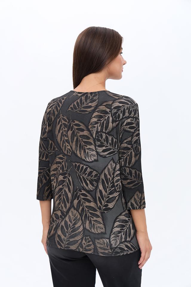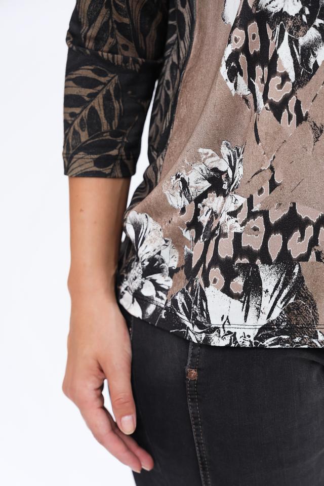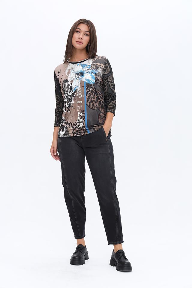Лонгслив имеет оригинальный принт с изображением крупных цветов на бежевом фоне, что делает его ярким и запоминающимся. Длинные рукава и округлый вырез горловины обеспечивают удобную посадку. Модель идеально сочетается с джинсами, брюками или юбками.