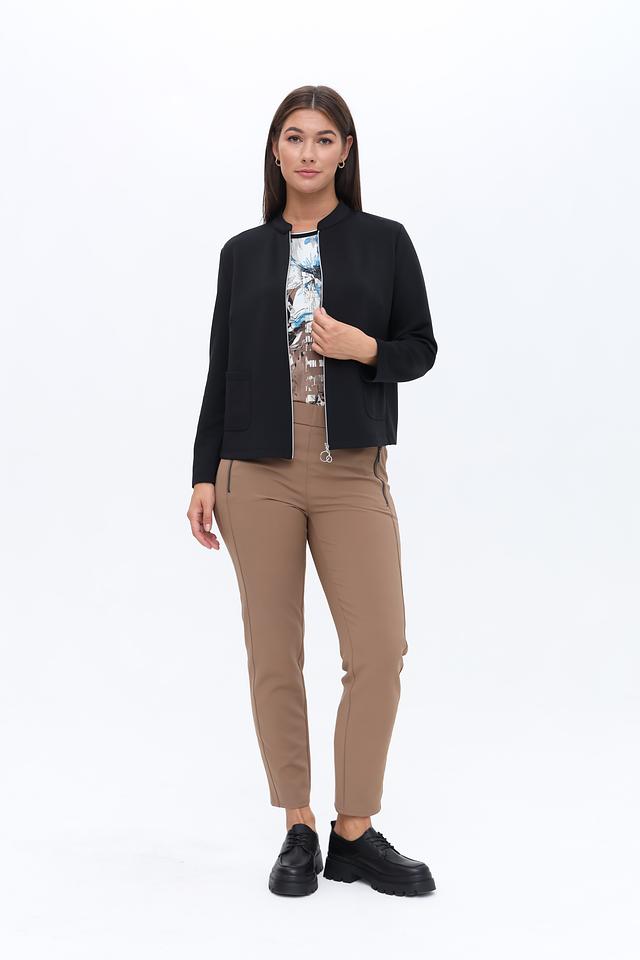 Жакет имеет классический крой с длинными рукавами и застёжкой на молнию. Воротник-стойка добавляет образу современности. Накладные карманы обеспечивают функциональность и практичность.