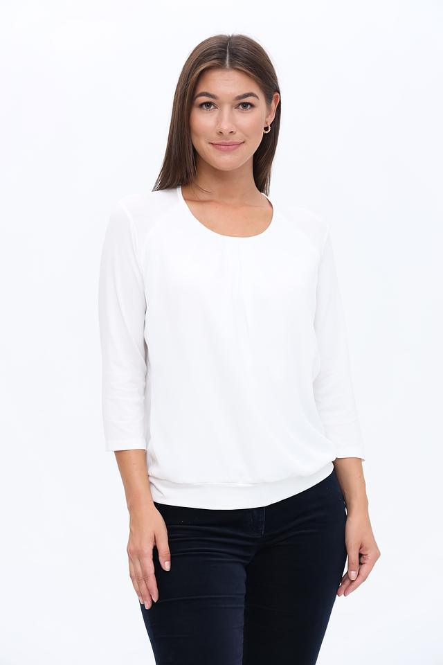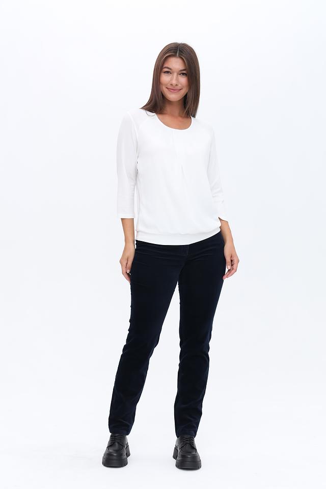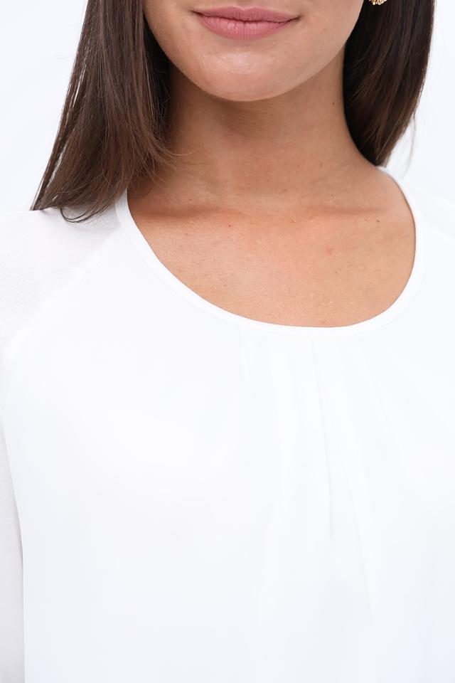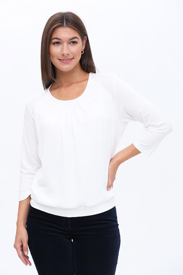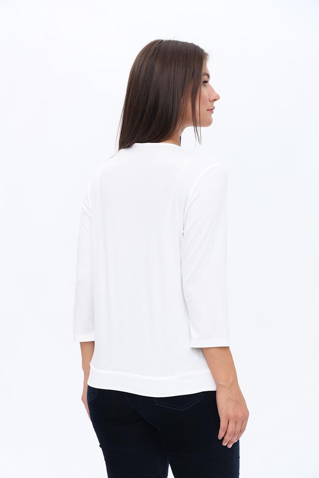 Блуза имеет прямой крой и длину до бедер, что делает ее подходящей для женщин любой комплекции. Рукав 3/4 добавляет образу изящества и женственности. Округлый вырез горловины подчеркивает красоту шеи и декольте.