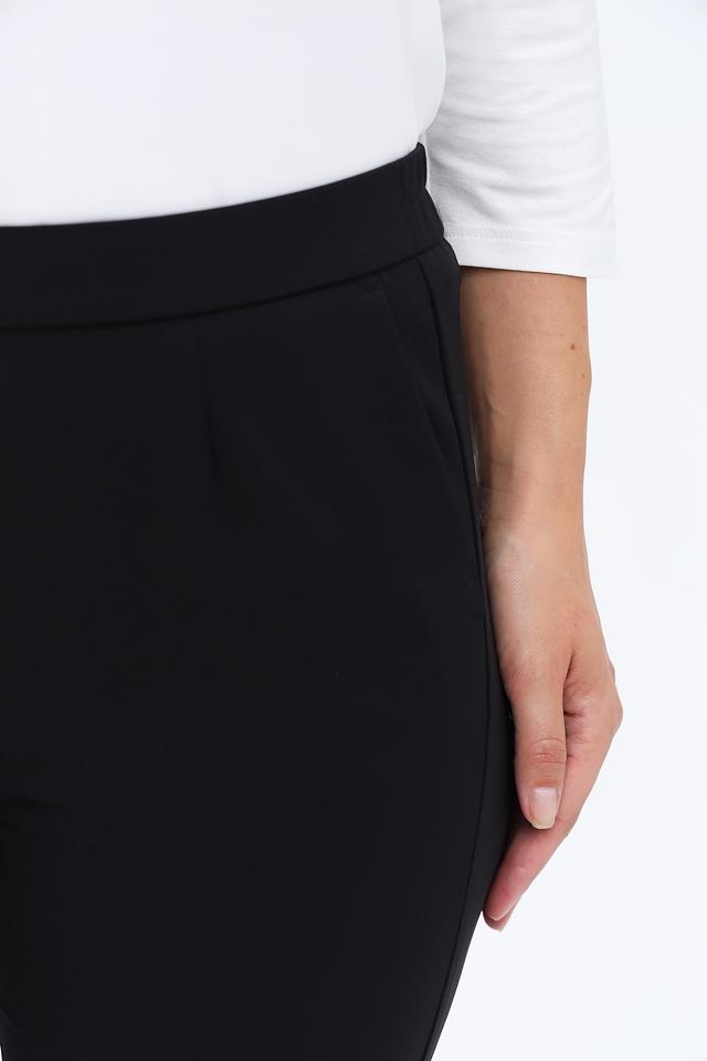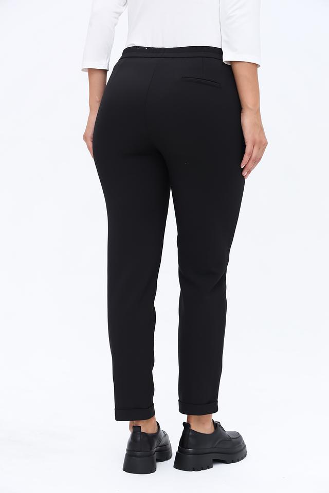 Брюки изготовлены из высококачественного полиэстера (87%) с добавлением эластана (13%), что обеспечивает приятные тактильные ощущения, хорошую посадку и устойчивость к сминанию. Эластичный пояс гарантирует удобство в носке.