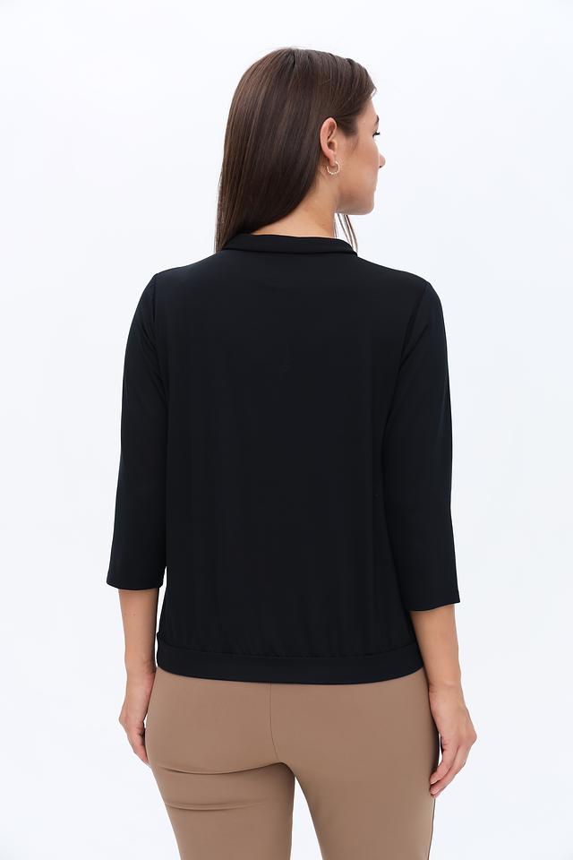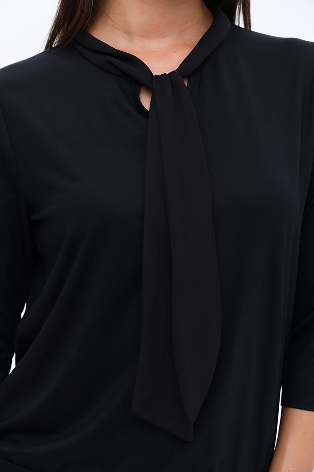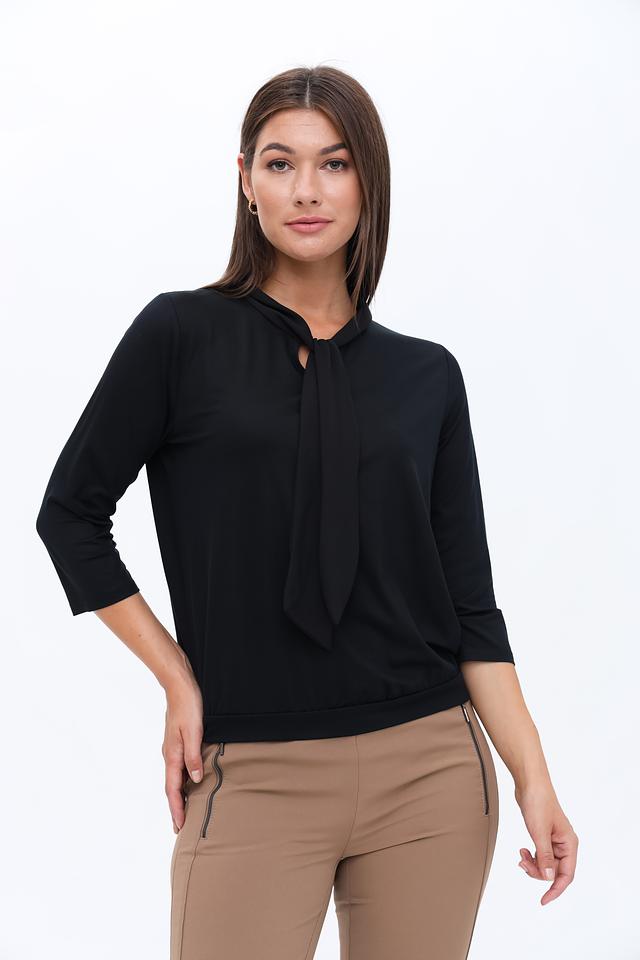 Чёрная блуза Frank Walder с элегантной завязкой на горловине. Модель выполнена из мягкой вискозы с добавлением эластана, обеспечивающего комфортную посадку. Идеально подходит для создания стильных образов. Состав: вискоза 93%, эластан 7%