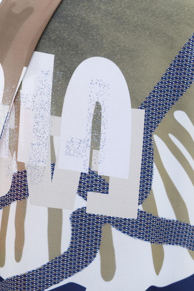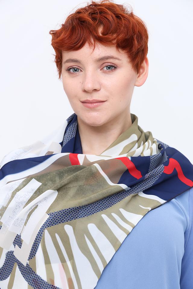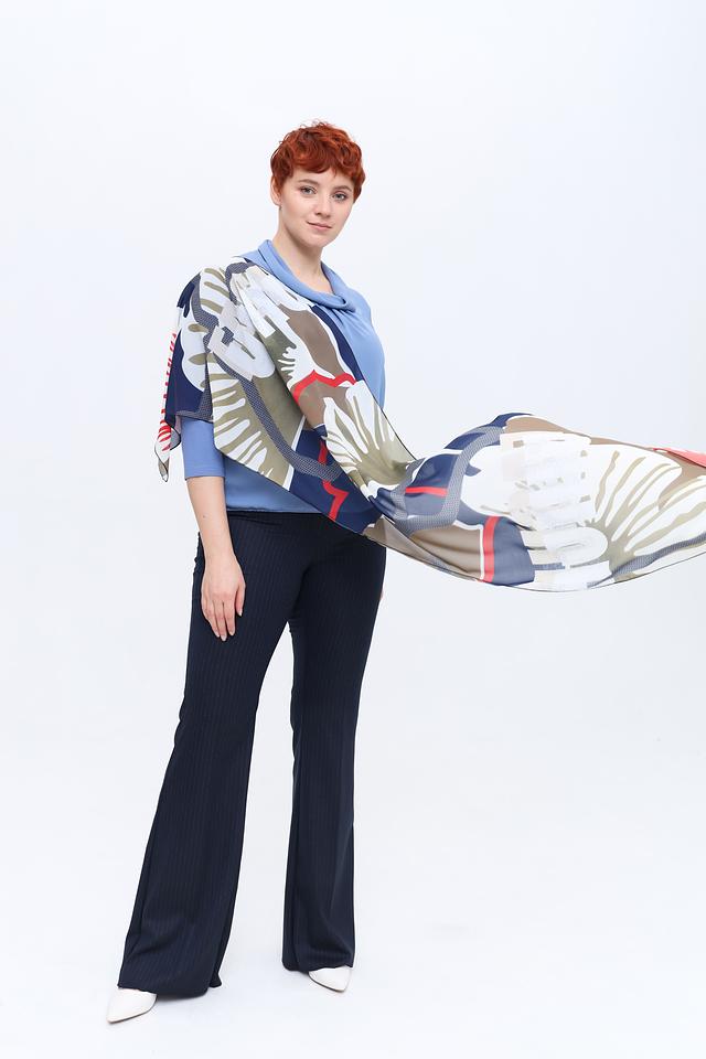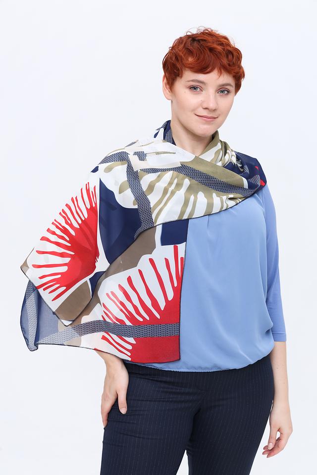 Дизайн шарфа представлен оригинальным тропическим принтом, сочетающим в себе различные оттенки синего, зеленого, белого и красного. Такое сочетание цветов позволяет легко сочетать шарф с различными элементами одежды.