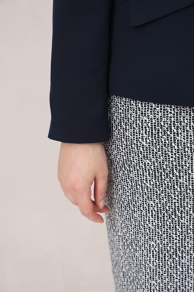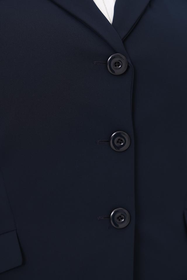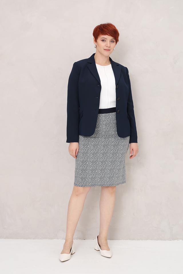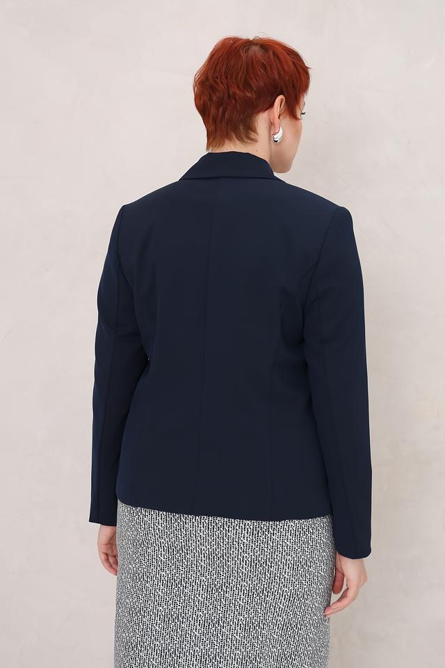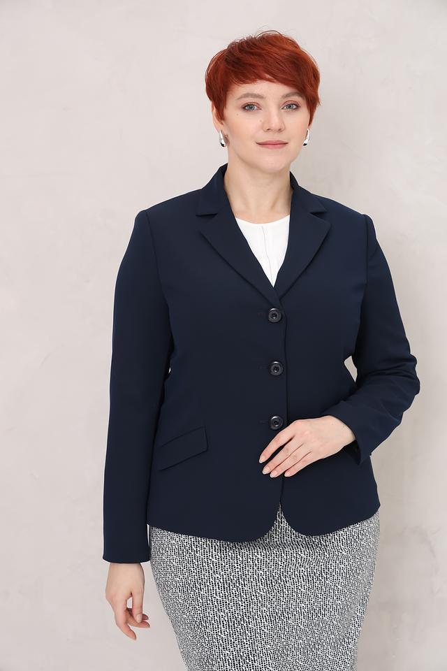 Жакет имеет приталенный силуэт, который подчеркивает фигуру, и застегивается на три пуговицы в тон изделия. Отложной воротник добавляет жакету строгости и делового вида. Длинные рукава обеспечивают комфорт в прохладную погоду.