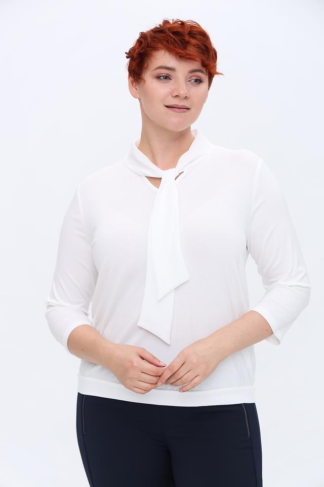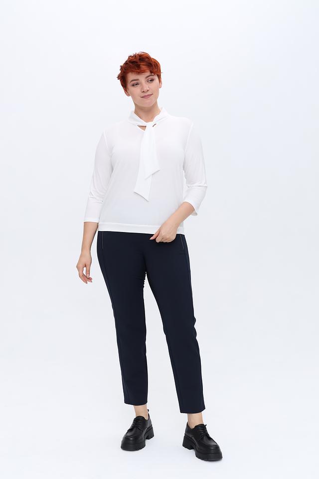 Блуза имеет прямой крой и длину до бедер. Отличительной особенностью модели является завязка на горловине, которая позволяет регулировать глубину выреза и добавляет образу изысканности.