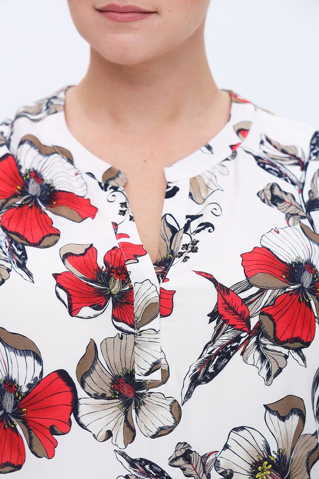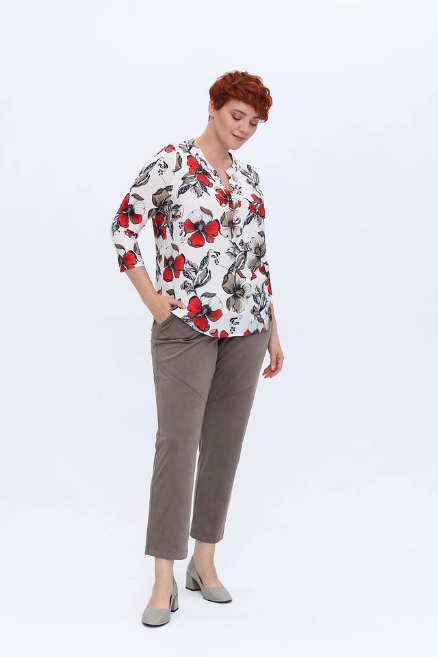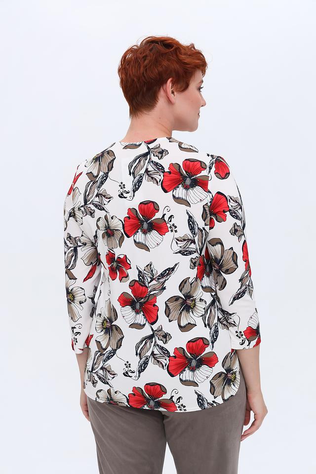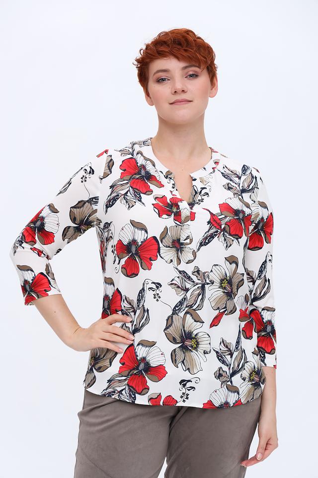 Основной цвет блузы – белый, но её украшает яркий и красочный принт с изображением маков. Красные, серые и чёрные оттенки цветов создают контрастный и запоминающийся рисунок. V-образный вырез и рукава длиной 3/4 придают блузе изящность и лёгкость.