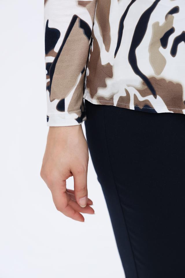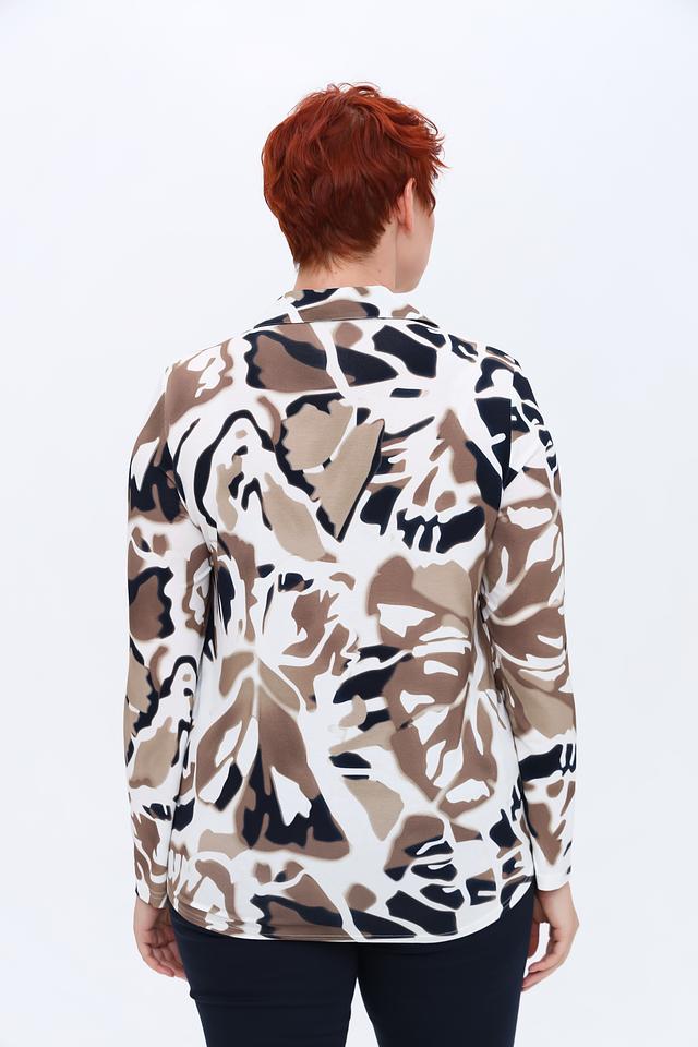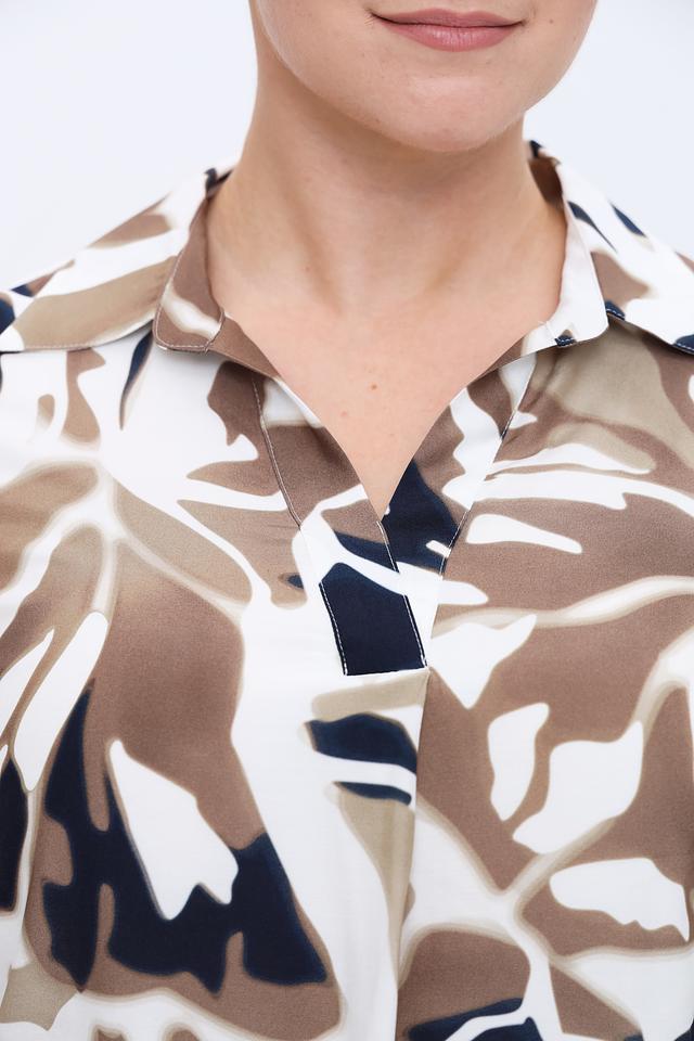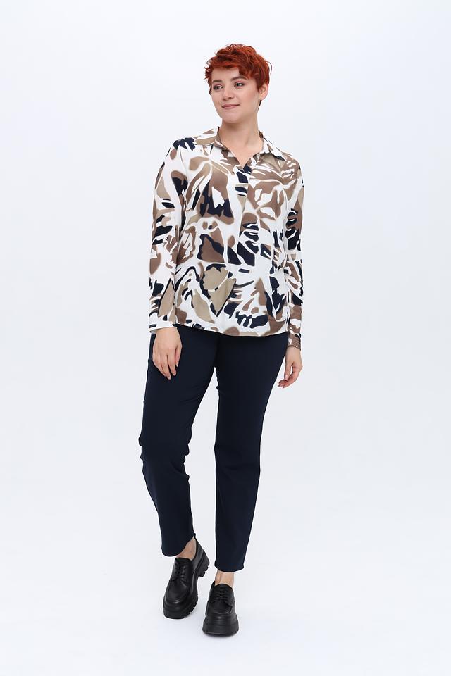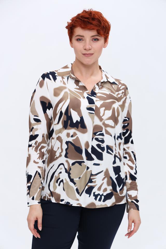Блуза имеет классический крой с длинными рукавами и отложным воротником. Главная особенность модели – эффектный абстрактный принт, сочетающий в себе оттенки бежевого, коричневого и тёмно-синего цветов. Такой рисунок придаёт блузе оригинальность и позволяет создавать интересные образы.