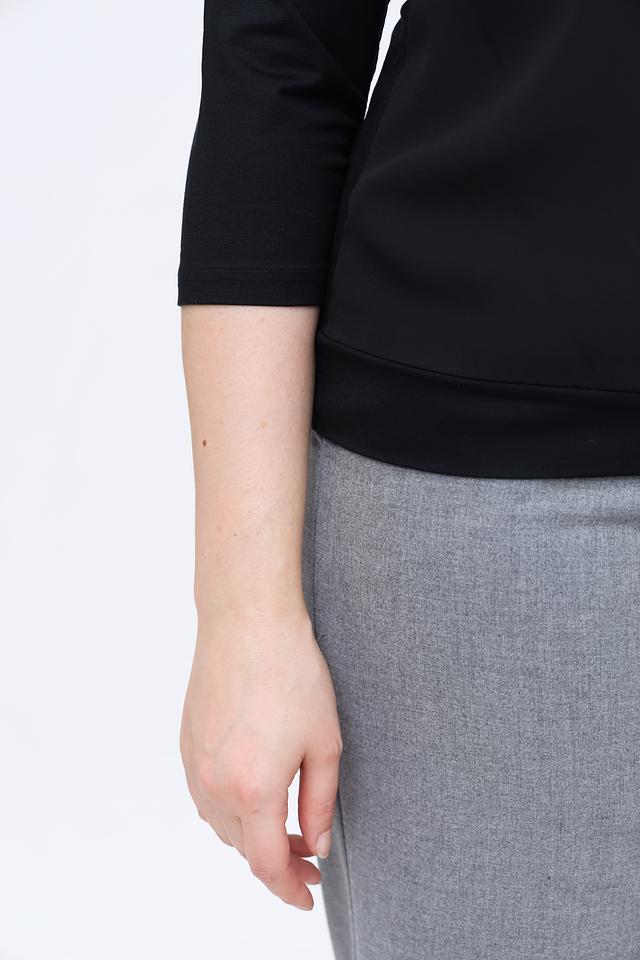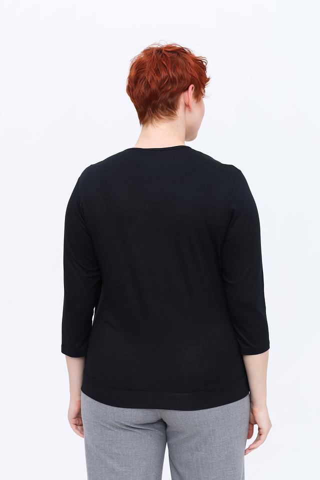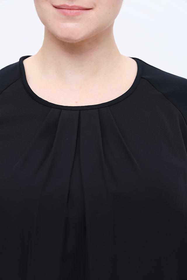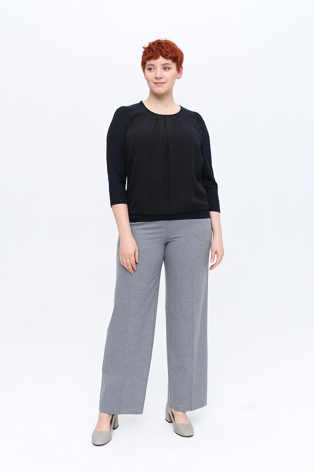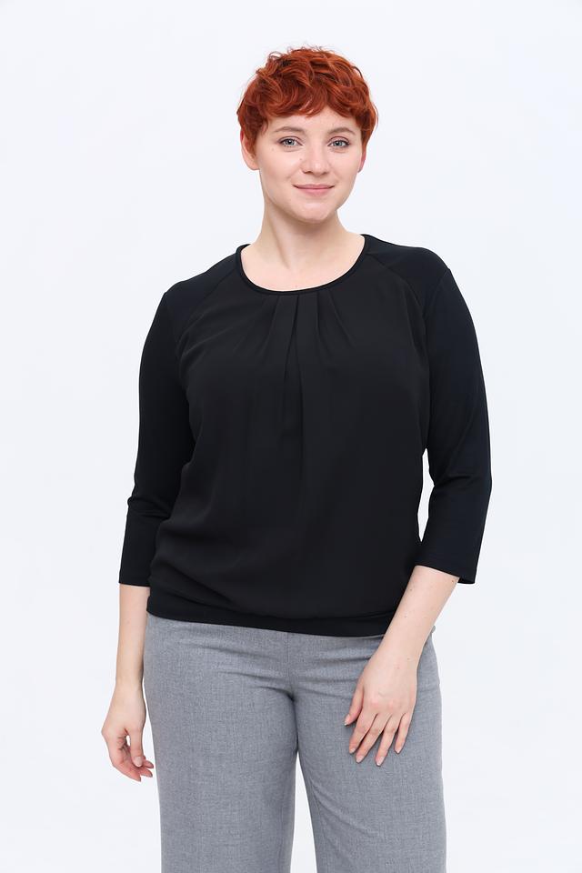 Блуза имеет округлый вырез горловины и аккуратную драпировку спереди, придающую ей изысканность. Рукава длиной три четверти делают ее универсальной для любого времени года.