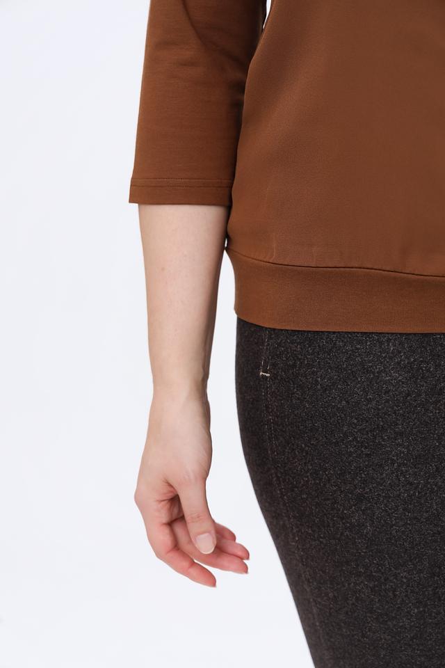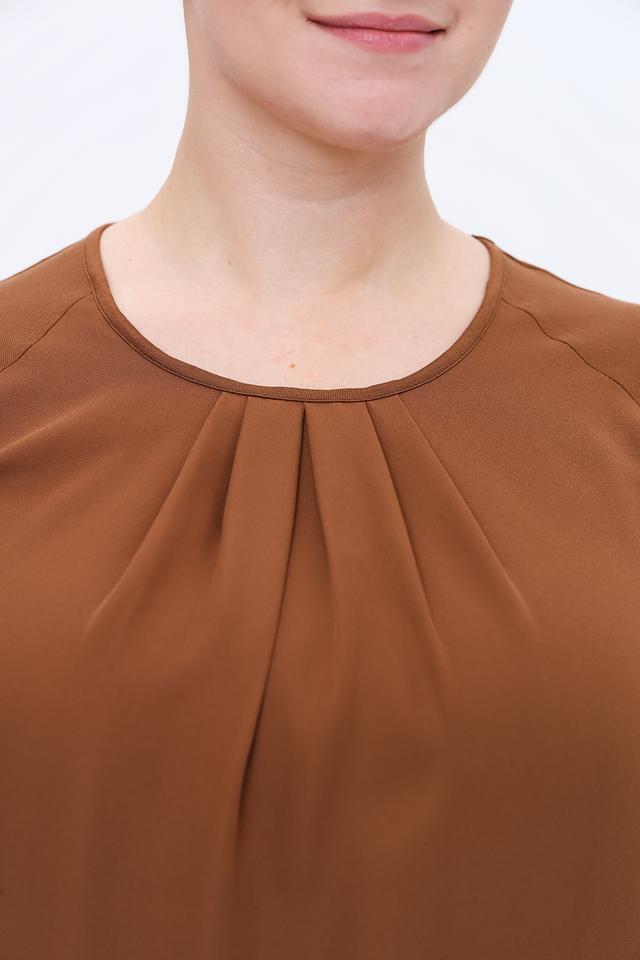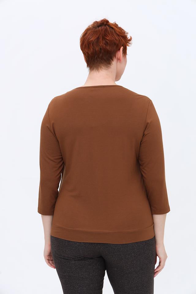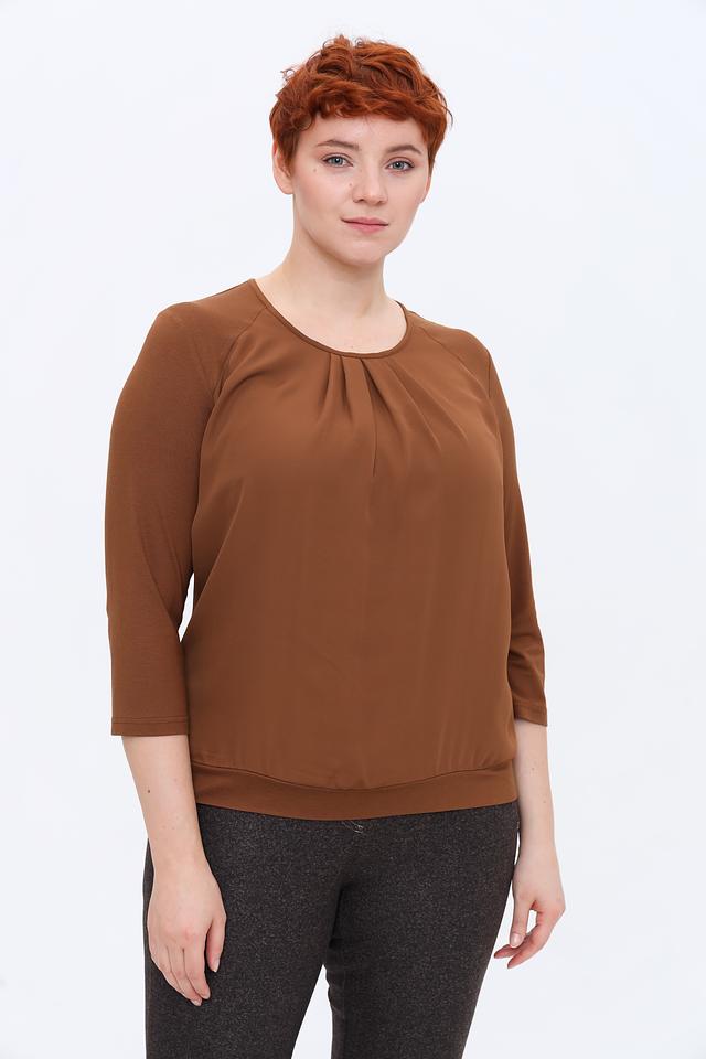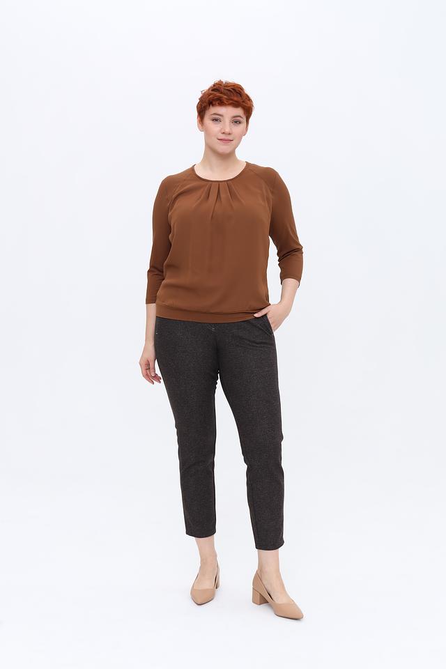 Модель имеет округлый вырез горловины, который украшен мягкой драпировкой, придающей блузе женственность и изящество. Рукава длиной три четверти делают ее универсальной для любого времени года.