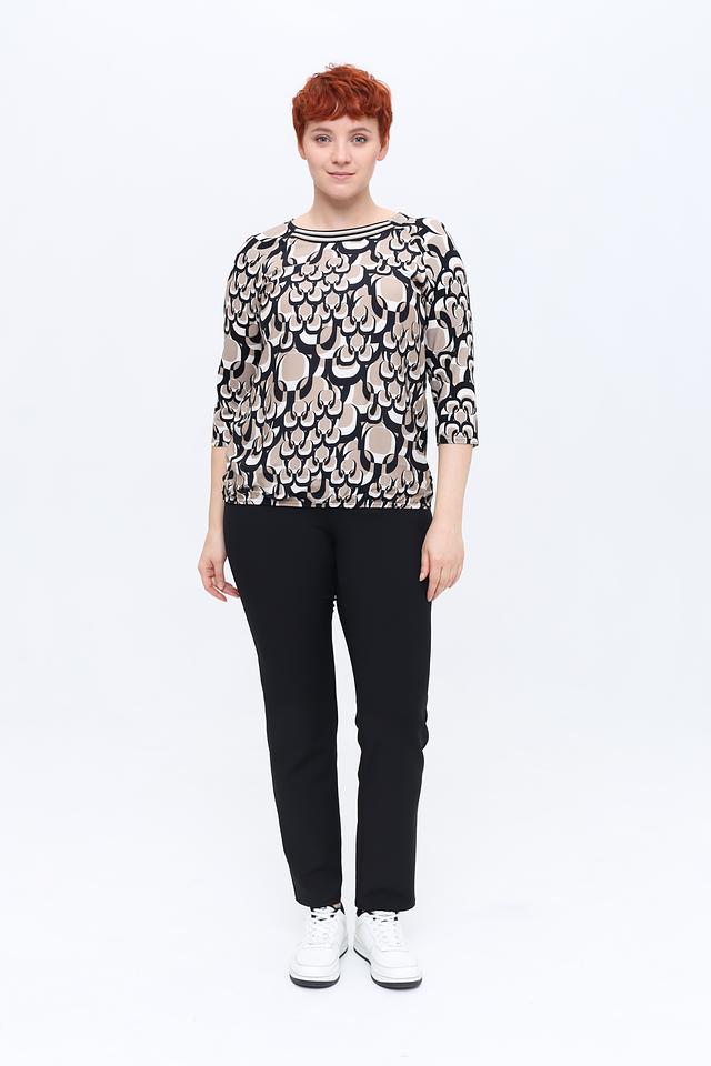 Женский лонгслив Frank Walder чёрно-бежевого цвета с оригинальным геометрическим принтом. Модель выполнена из мягкой вискозы с добавлением эластана, обеспечивающего комфортную посадку по фигуре. Состав: вискоза 96%, эластан 4%