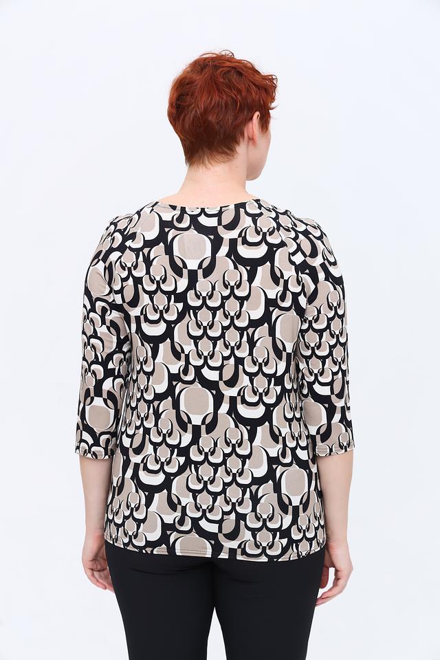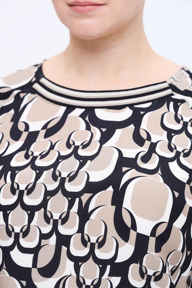 Лонгслив имеет прямой крой и длину до бедра, что делает его универсальным для создания различных образов. Особенностью модели является оригинальный геометрический принт в чёрно-бежевой гамме, который придаёт изделию изысканность и индивидуальность.