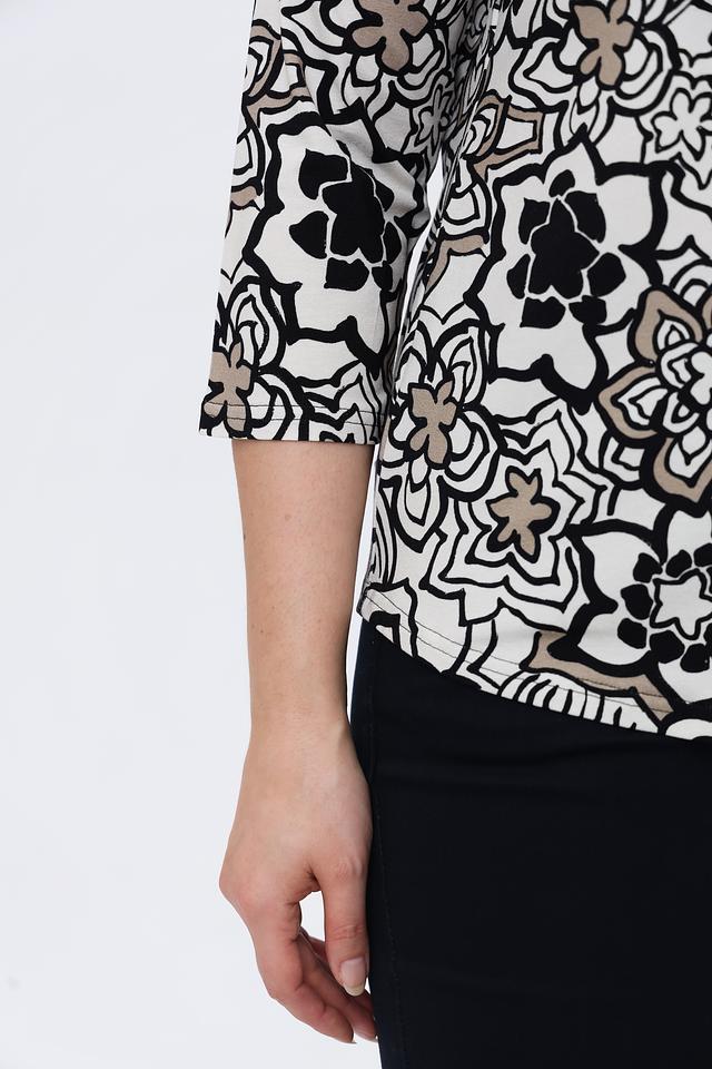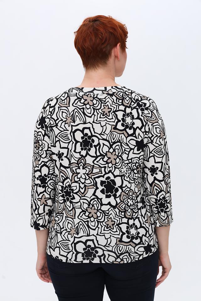 Лонгслив имеет округлый вырез горловины и рукава длиной 3/4, что делает его универсальным для любого времени года. Особенностью модели является яркий и оригинальный цветочный принт, который добавит образу женственности и индивидуальности.