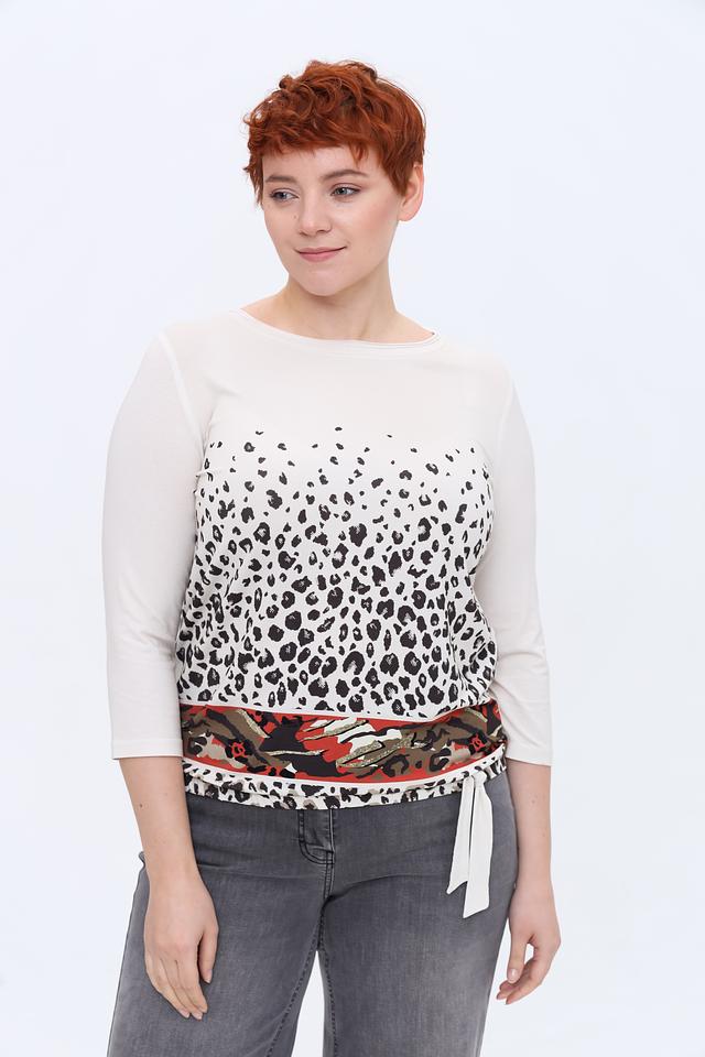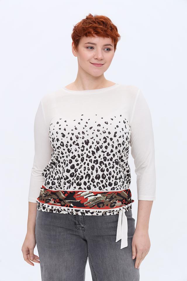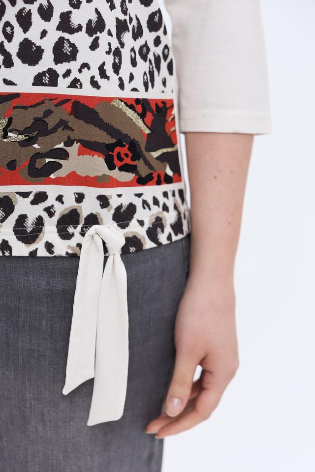 Лонгслив имеет кремовый цвет и украшен ярким леопардовым принтом в нижней части. Дополнительным акцентом служит декоративная лента с цветочным узором, которая подчеркивает талию и придает образу женственность.