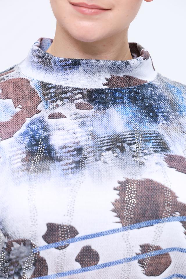 Пуловер имеет высокий воротник-стойку, который добавляет образу элегантности. Главная особенность изделия – яркий и необычный принт, сочетающий в себе оттенки синего, коричневого и белого. Такой рисунок сделает ваш образ запоминающимся и оригинальным.