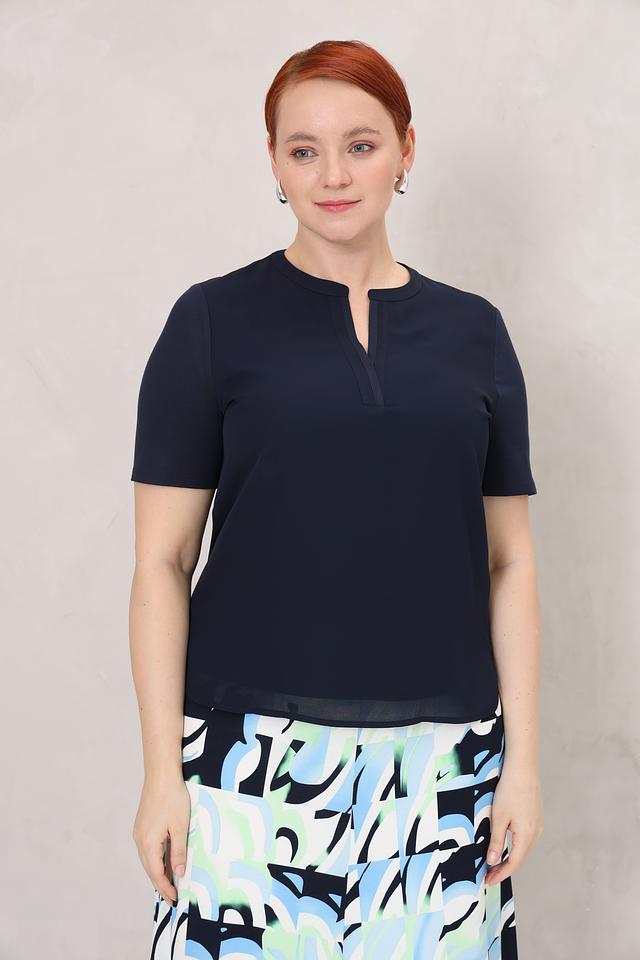 Блуза имеет прямой крой, короткие рукава и V-образный вырез, обрамленный аккуратной отделкой. Материал – мягкая и приятная к телу вискоза с добавлением эластана, обеспечивающая комфорт при носке и хорошую посадку по фигуре.