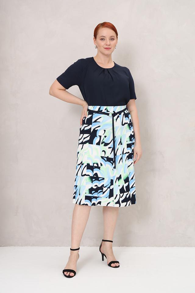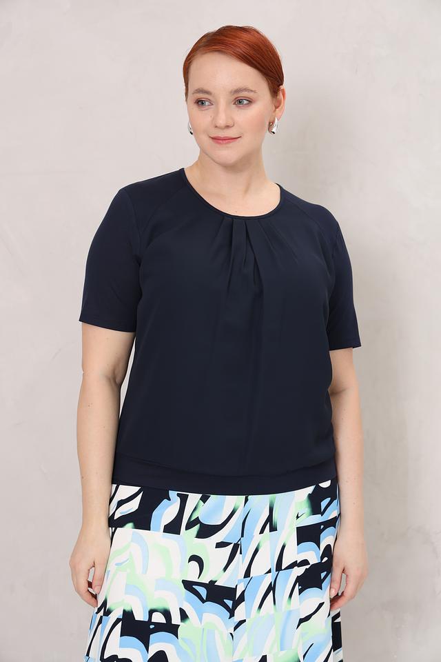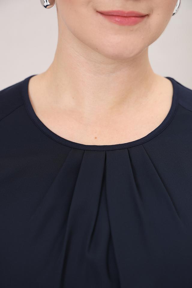 Блуза имеет классический крой с короткими рукавами и округлым вырезом горловины. Особый акцент сделан на драпировке в области груди, которая визуально корректирует силуэт и добавляет образу элегантности.