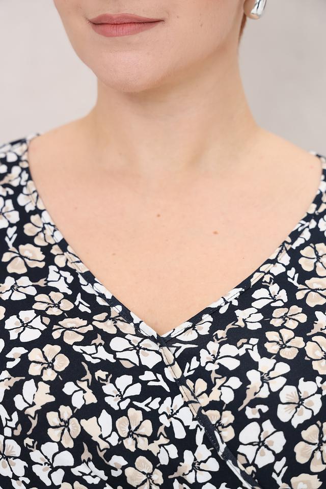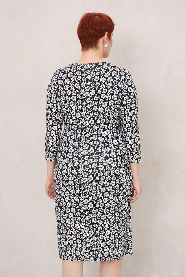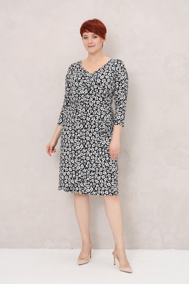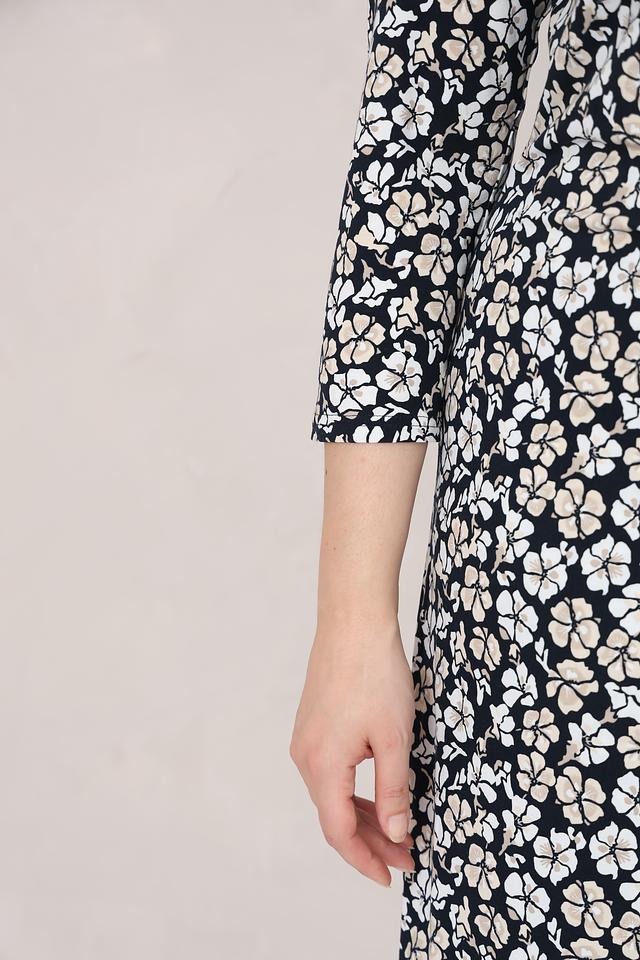 Платье имеет приталенный силуэт, который подчеркивает достоинства фигуры. V-образный вырез горловины и рукава длиной три четверти придают образу изящество и женственность. По всей поверхности платья расположен мелкий цветочный принт, который добавляет романтичности.