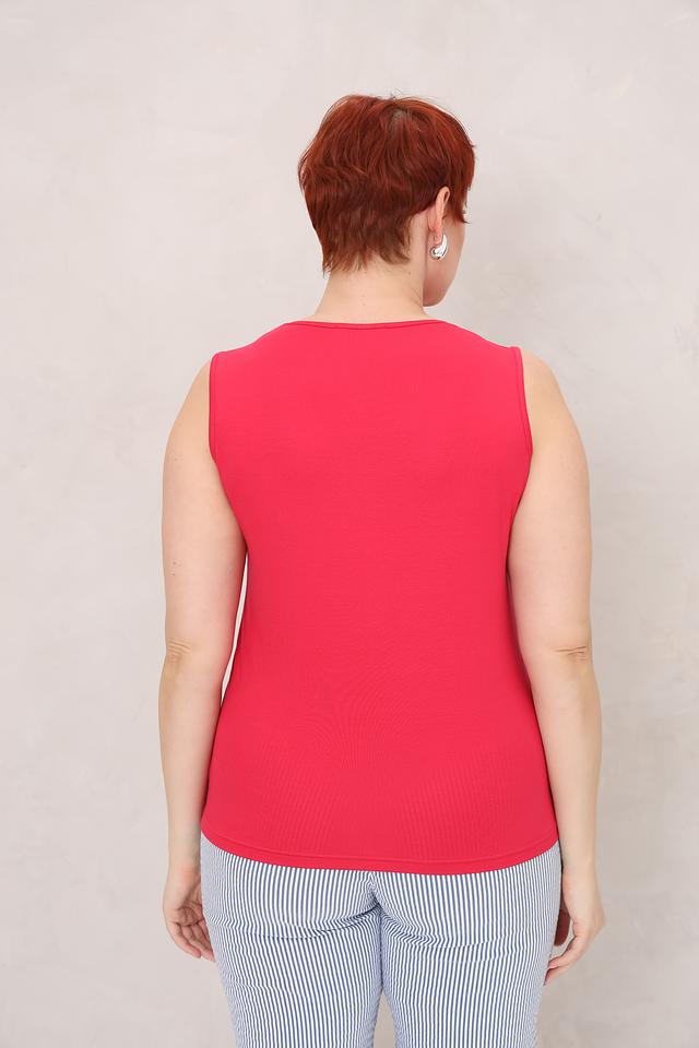 Топ имеет классический крой без рукавов и круглый вырез горловины. Насыщенный малиновый цвет делает его ярким и привлекательным. Благодаря простому дизайну, этот топ легко сочетается с различными элементами одежды — от джинсов и шорт до юбок и брюк.