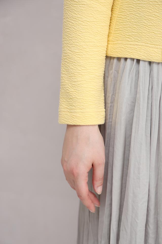 Жакет имеет классический крой с длинными рукавами и небольшим воротником-стойкой. Застёжка выполнена в виде молнии, что делает его удобным в носке. Текстурированная поверхность ткани добавляет изделию изысканности и визуального интереса.