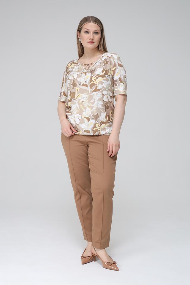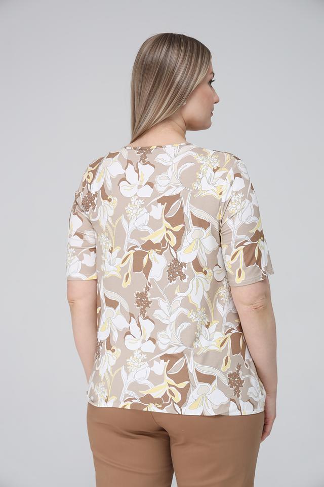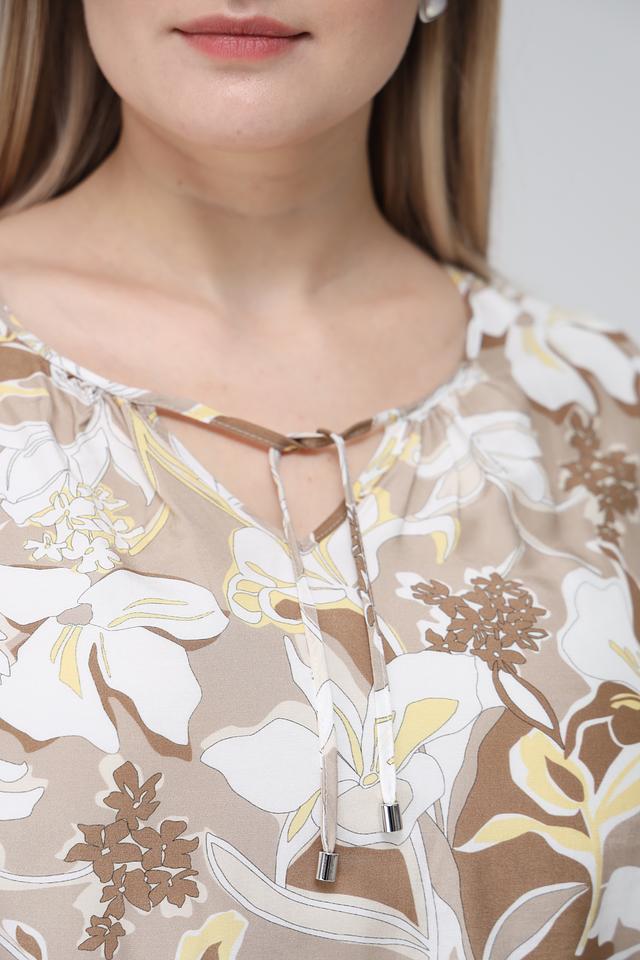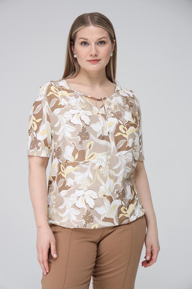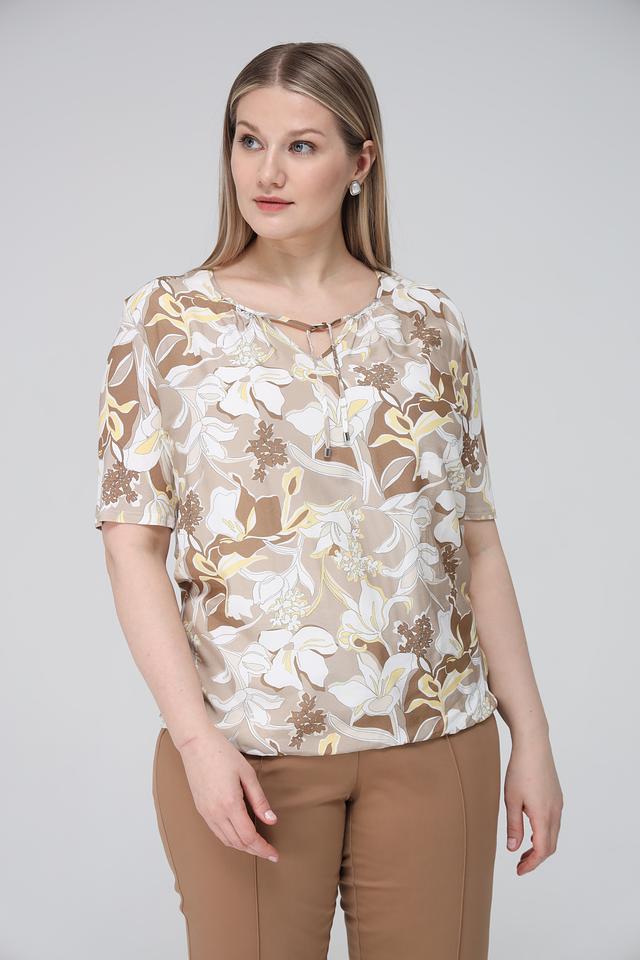 Основной цвет блузы – бежевый, а яркий цветочный принт, состоящий из белых, желтых и коричневых оттенков, придает ей особую изысканность и женственность.
