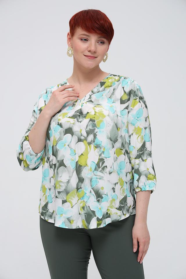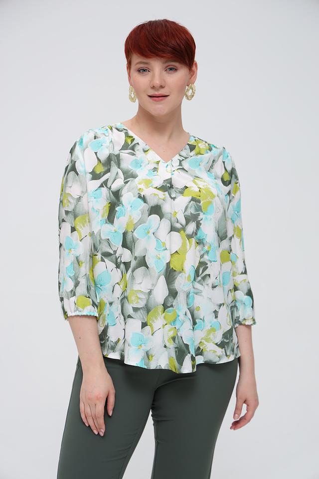 Женская блуза Frank Walder светло-зелёного цвета с ярким цветочным принтом. Модель выполнена из лёгкой вискозы, имеет V-образный вырез и рукава 3/4 с небольшим буфом. Состав: вискоза 100%